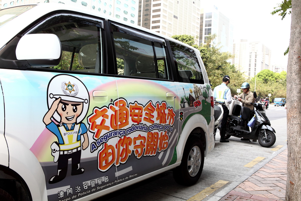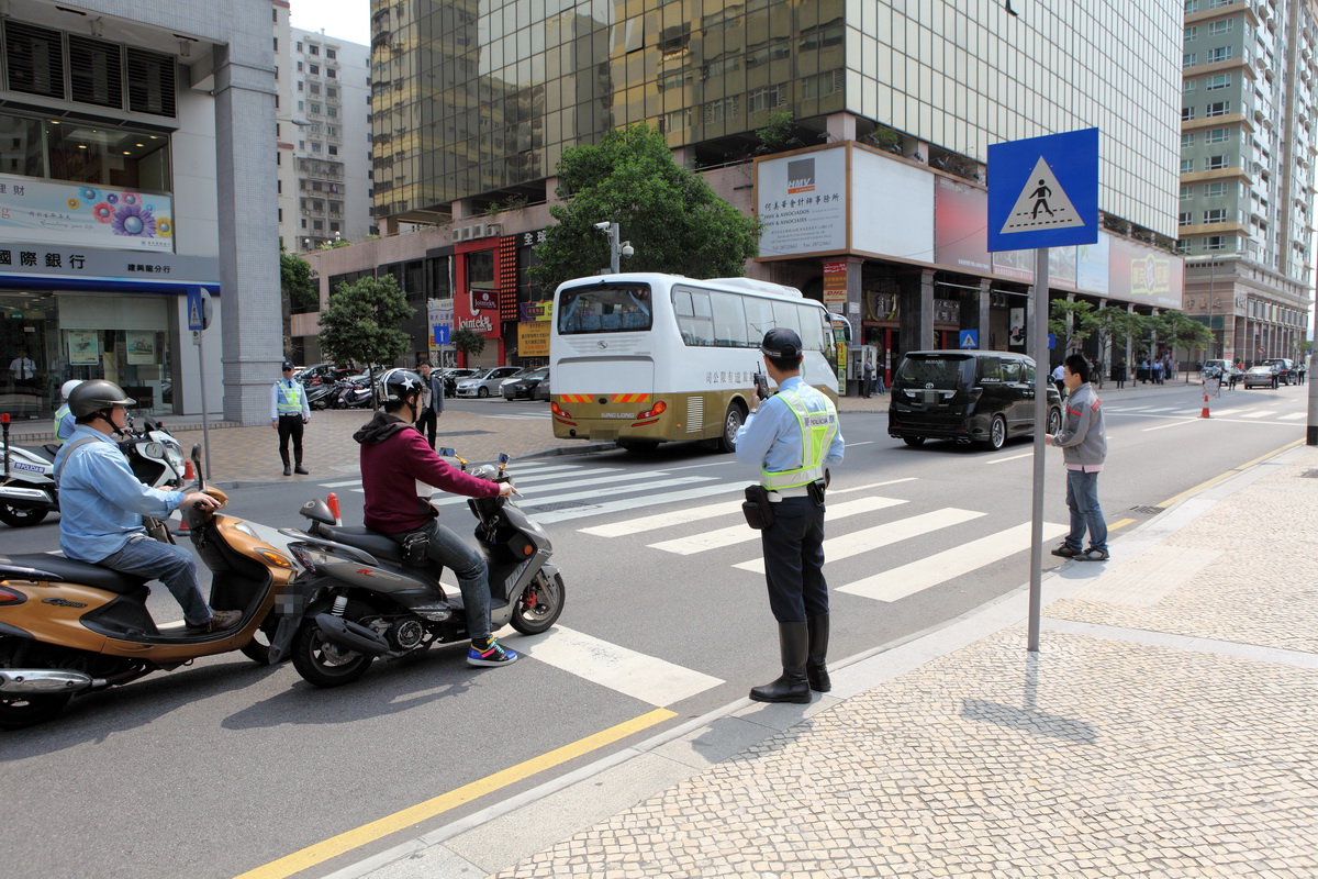 今天上午,本局交通廳警司張映順、副警司容仕培及張建欣一行12人,在澳門宋玉生廣場及建興龍廣場一帶,針對斑馬線不讓先採取檢控行動。是次行動是配合交通安全推廣活動而進行。本局考慮到去年在人行橫道發生涉及行人及車輛的交通事故有所上升,由2010年的276宗增至2011年的323宗,故加強檢控,提升守法意識。
