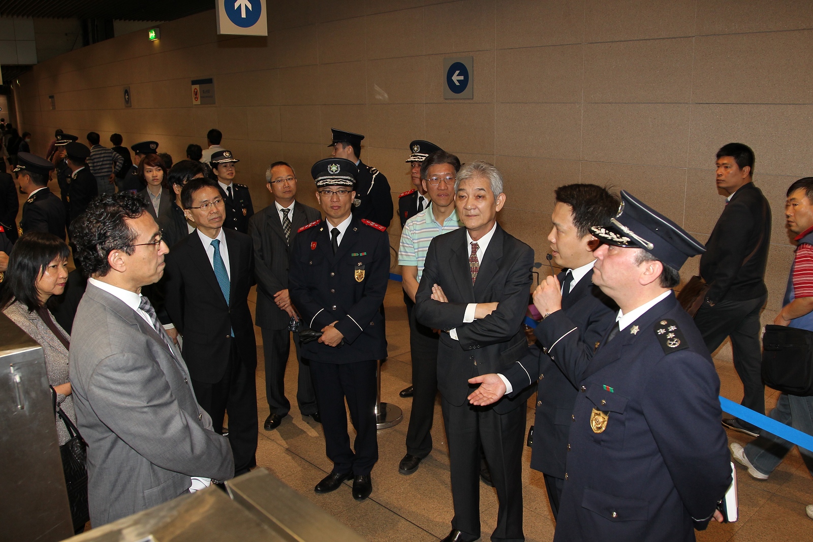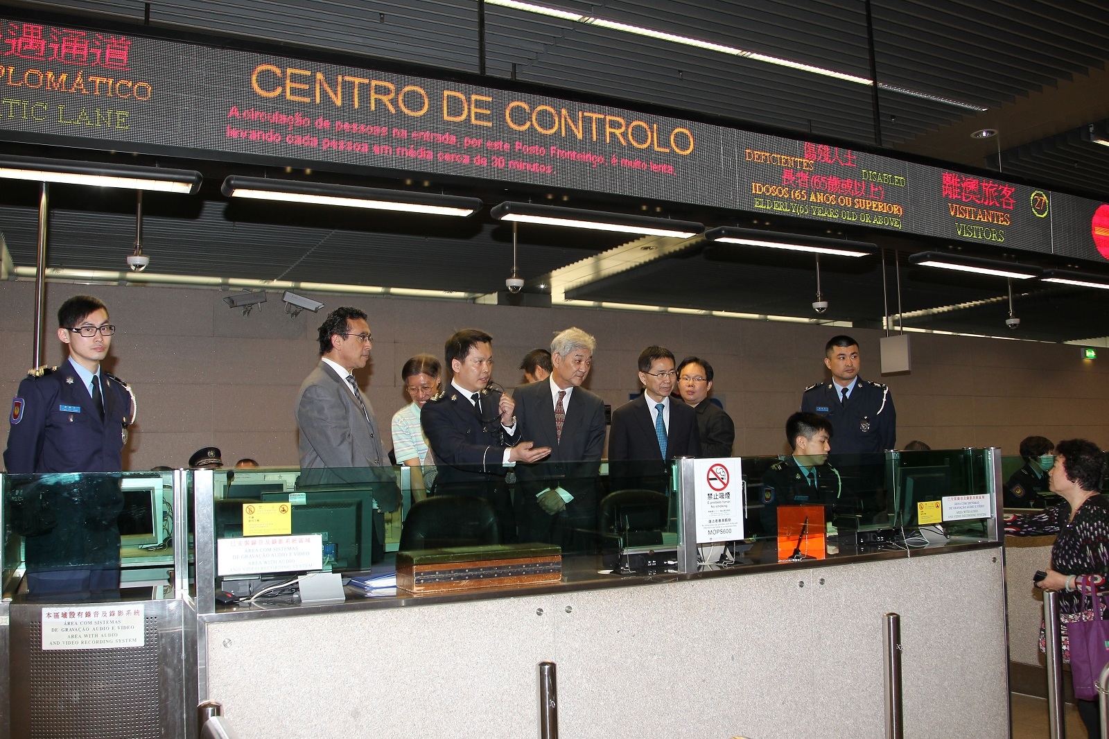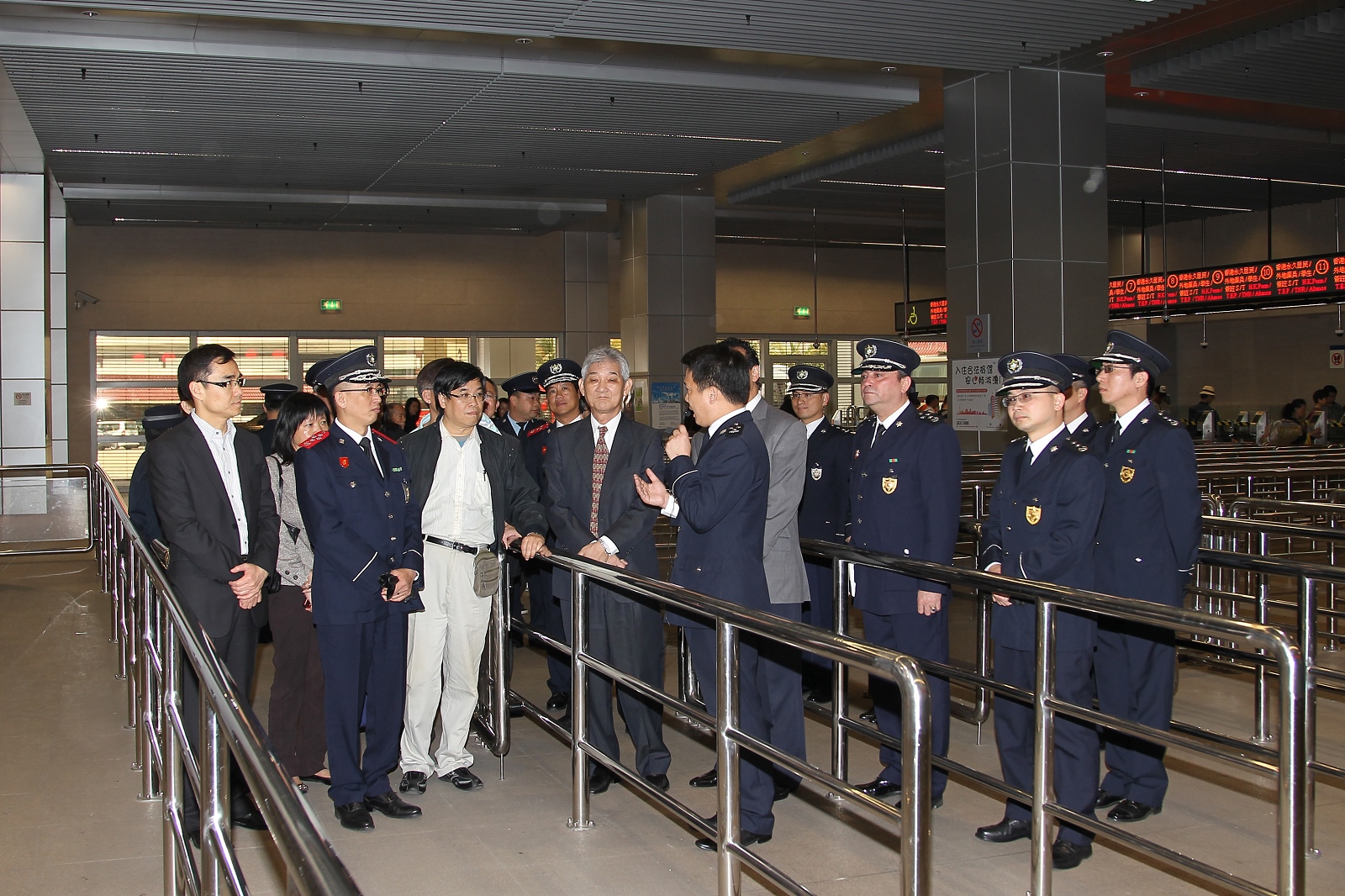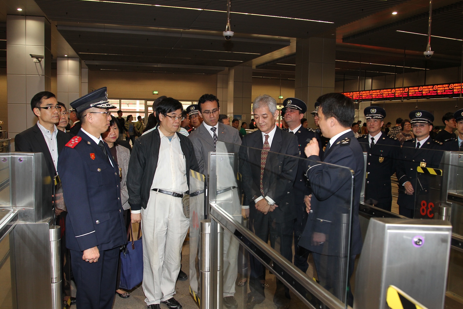 隨後,參觀團移師關閘邊境站,現場視察離境及入境大堂的運作情況,並由出入境事務廳人員向議員講解有關出入境驗證櫃台、控制台、自助過關通道、長者專道的運作及相關的出入境設施。議員對有關運作表示關注並積極提出了問題和意見。