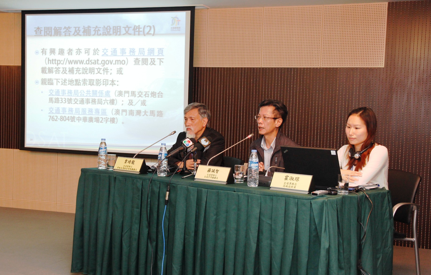 就公眾對競投案卷的疑問,交通事務局已按照競投案卷的規定,對競投案卷的內容作出解答,並因應需要作出補充說明。解答及補充說明文件已附載於競投案卷內,有意查閱人士可前往馬交石炮台馬路33號交通事務局六樓公共關係處查閱外,也可於上址或中華廣場2樓交通事務局服務專區索取文件影印本,又或是於交通事務局網頁(www.dsat.gov.mo)下載。