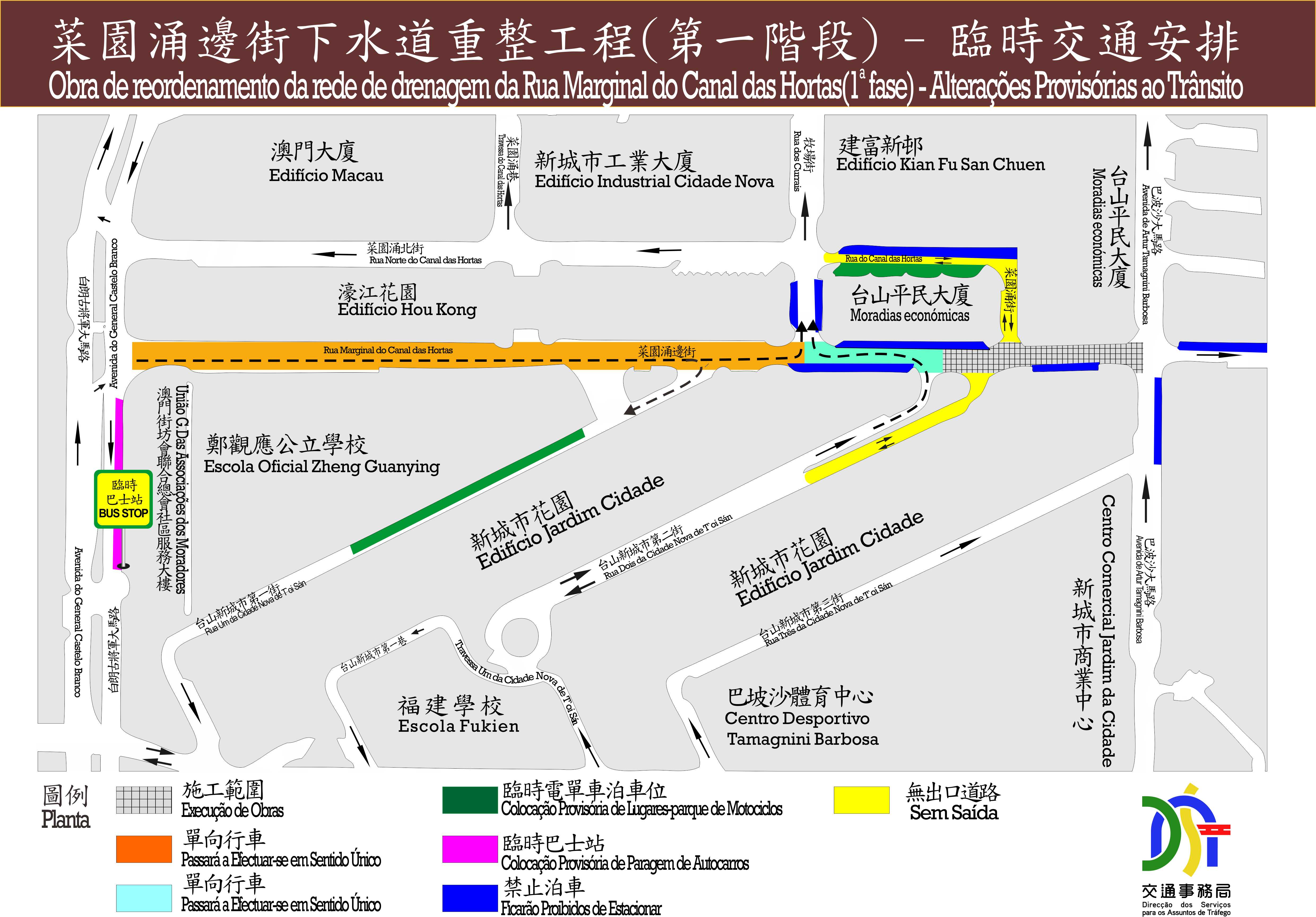 配合民政總署開展下水道及行人道整治工程,菜園涌邊街等多處路段將於本月7日(周一)上午11時起實施多項臨時交通管制措施,其中菜園涌邊街部分路段將封閉交通,而部分則改為單向通車,至於34路線巴士總站會暫時遷往白朗古將軍大馬路近澳門街坊會聯合總會社區服務大樓對出路段,為期30日,交通事務局呼籲市民和駕駛者留意有關交通改動。