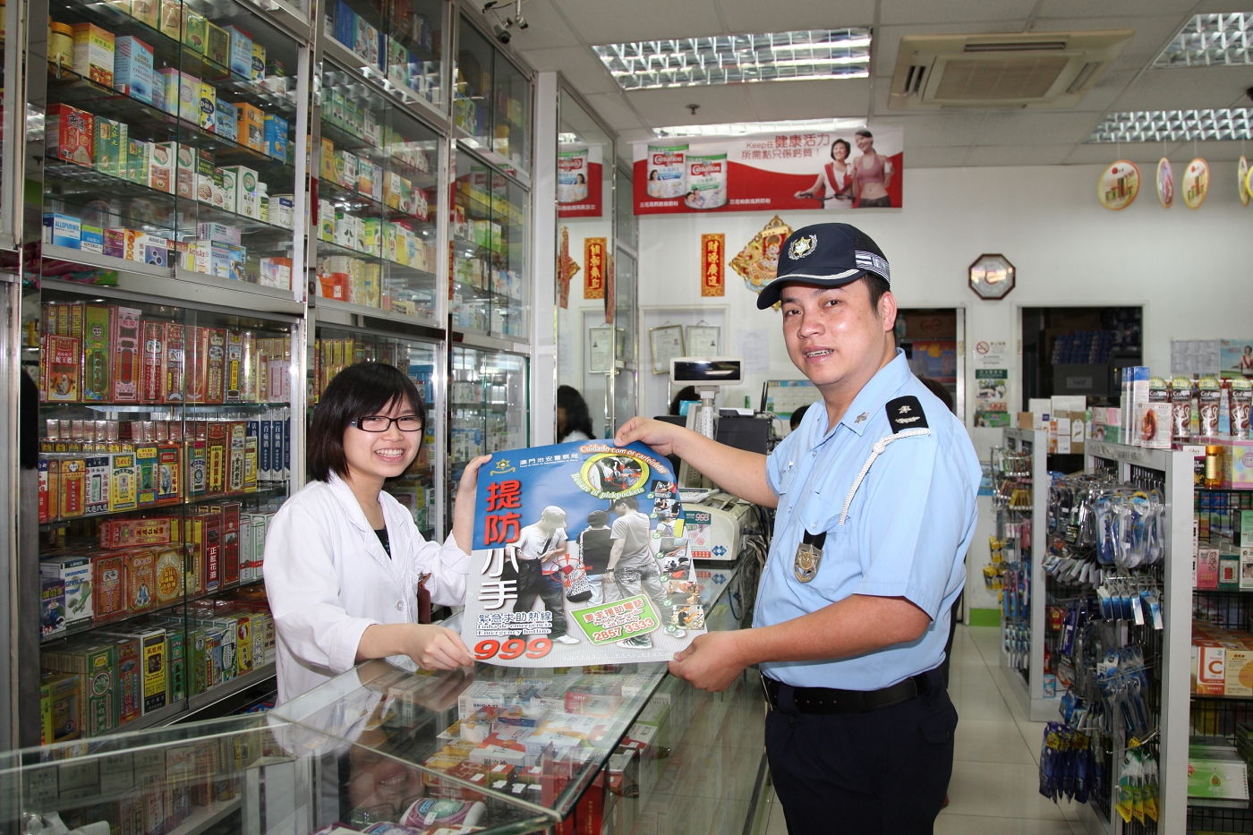 今日上午,治安警察局與新口岸坊眾互助會聯合進行社區防罪宣傳活動,本局行動廳副警司黃超文、澳門警務廳警長林錦豪等一行十人,與坊會副理事長陳愛珠、何寬慈以及理事戴鷹、劉國燊、溫絳璿等,針對大廈治安環境到區內數個大型屋苑發掘警情,派發防罪宣傳品。
