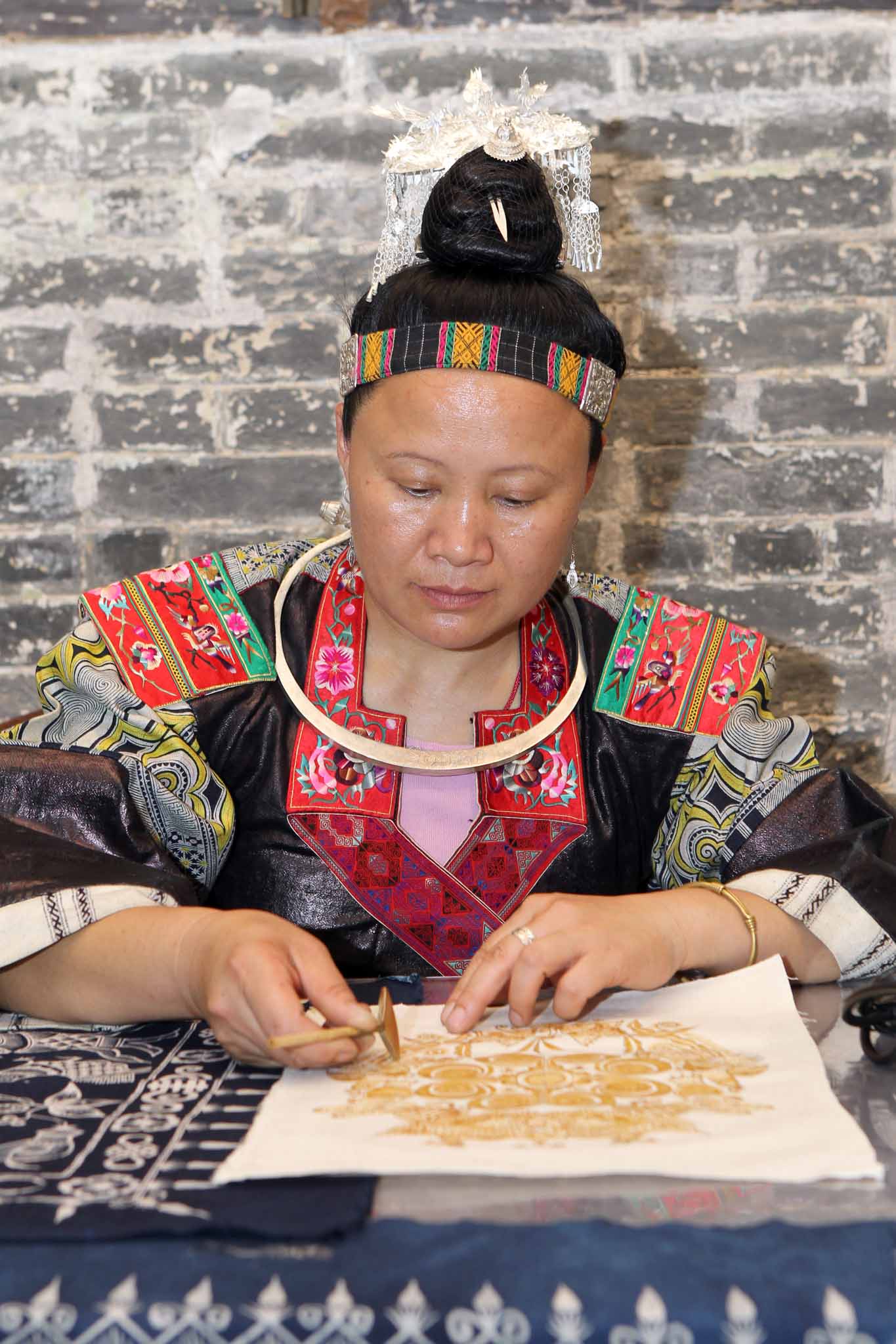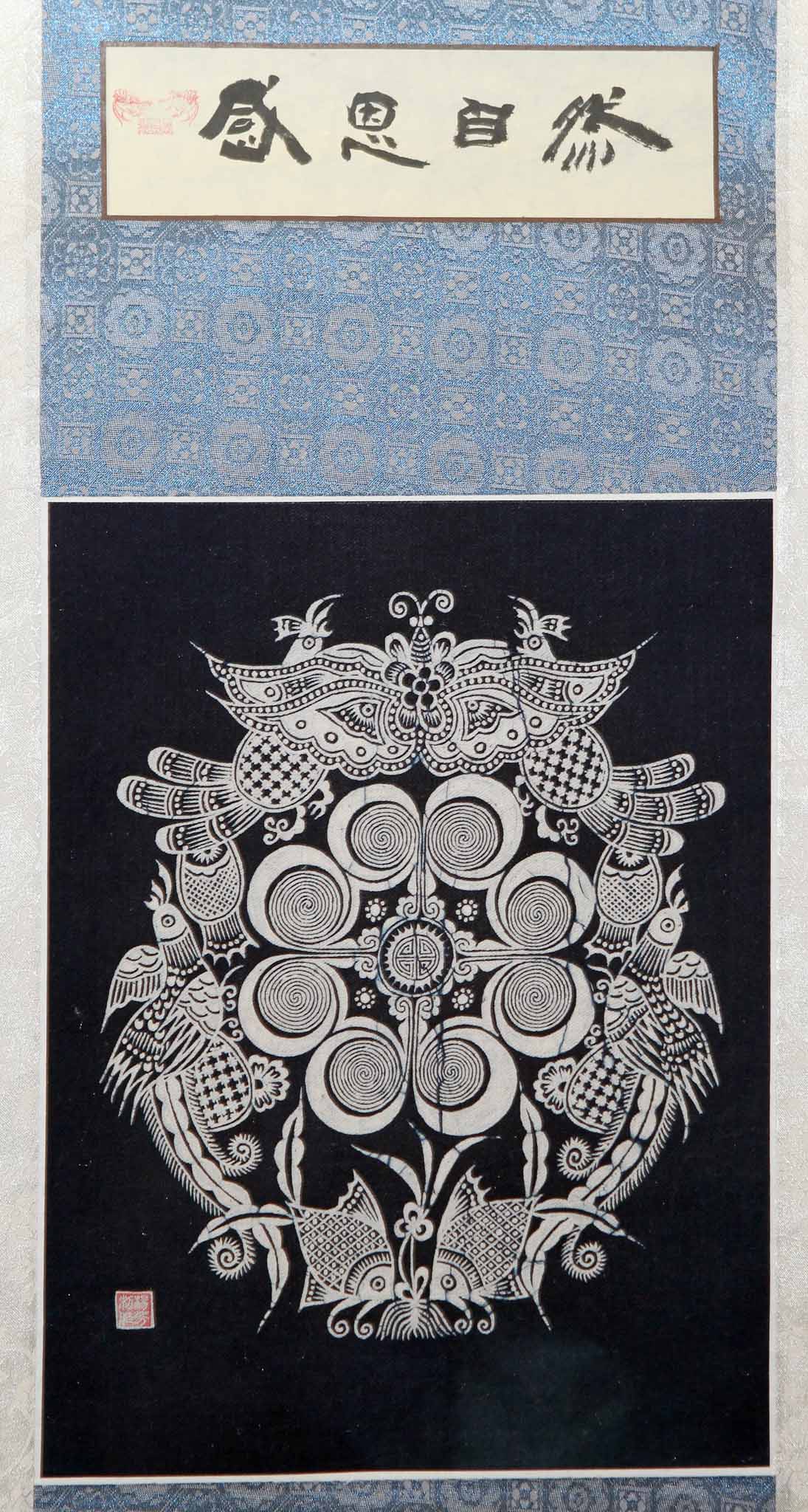蠟染是我國古老的民間傳統紡織印染手工藝,是用蠟把花紋點繪在天然纖維織物上。丹寨苗族蠟染的婦女們,喜歡以自然界中的花鳥魚蟲做素材進行蠟染,亦有以較為抽象的幾何紋樣為日常生活用品增添雅趣。工藝家楊芳為“丹寨蠟染”傳承人、高級工藝師,作品淋漓盡致地展現苗族支系的文化背景和歷史,美輪美奐,她更創辦了蠟染專業合作社,培養了大批傳承人,產品暢銷國內外。