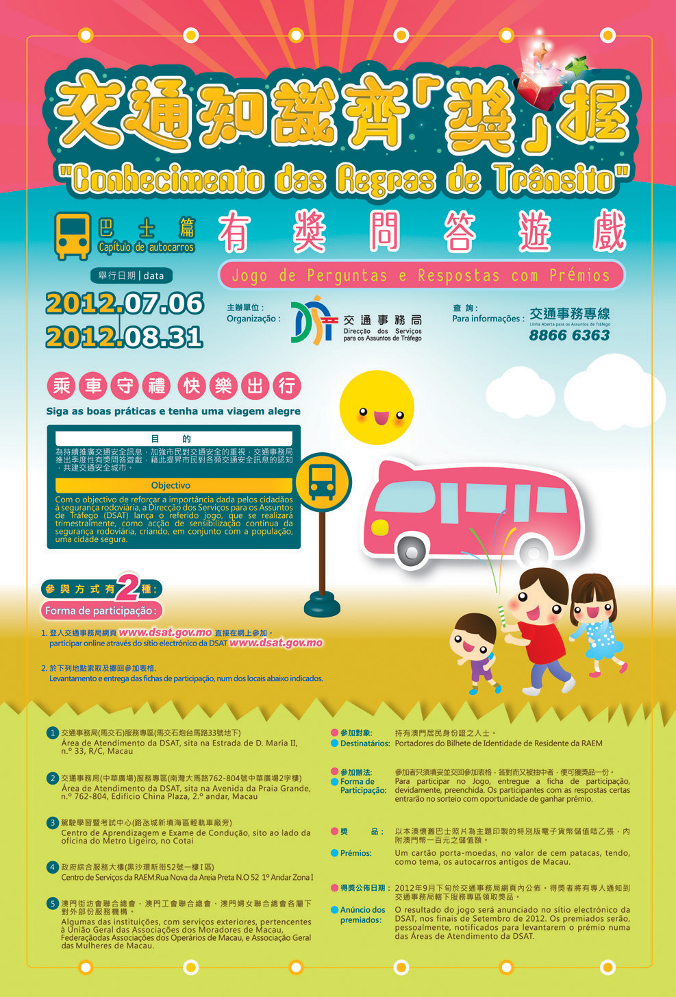 新一期“交通知識齊「奬」握”-有獎問答遊戲由7月6日至8月31日舉行,是次主題為「巴士篇」,交通事務局希望透過問答遊戲喚起市民留意乘坐巴士時的注意事項,參加者只要登入交通事務局網頁www.dsat.gov.mo直接回答問題,或是於指定地點索取、填妥並擲回參加表格,答對問題即可自動參加抽獎,贏取特別版電子貨幣儲值咭一張,歡迎公眾踴躍參與。