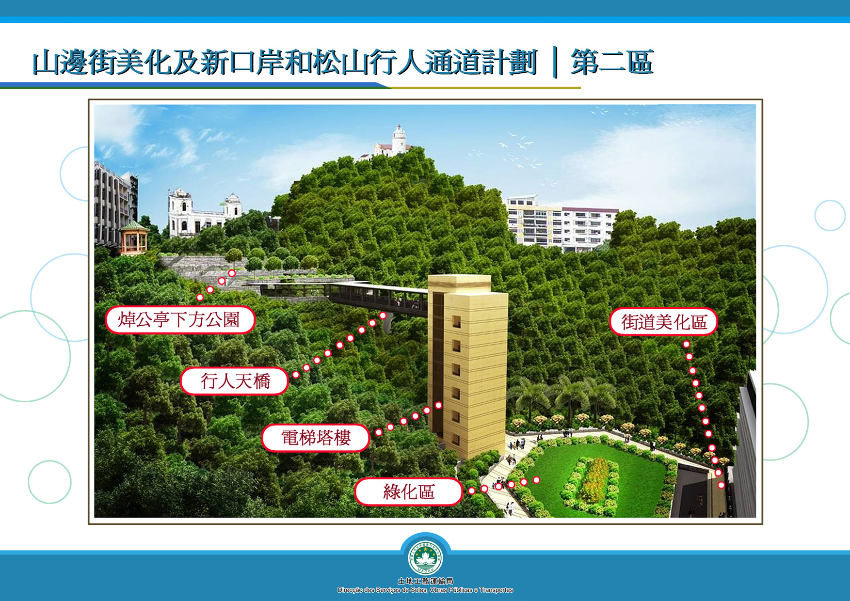 為構建一個和諧舒適的步行空間,其他工程包括設置綠化區、道路美化及山坡整治等亦同樣重要。至於第一區及第三區工程,土地工務運輸局將於適當時候展開招標的相關工作。