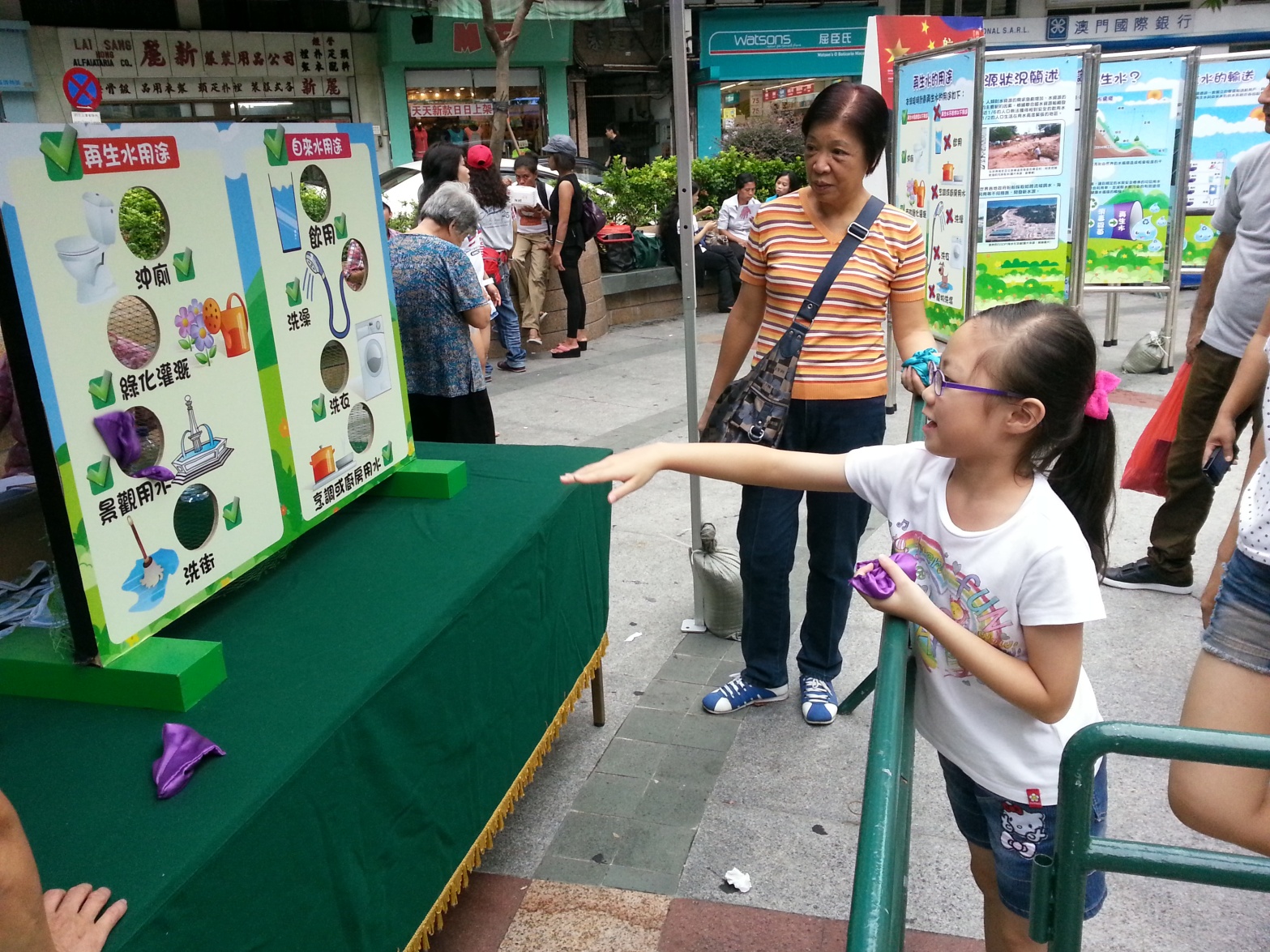 今日下午二時半至五時,小組在三盞燈圓形地舉辦再生水社區巡迴推廣活動,現場設置多個以再生水為主題的攤位遊戲,並展出再生水資訊展板,內容包括再生水的處理過程、用途、其他國家使用再生水的例子等。參與遊戲的市民均獲贈節水器具或精美紀念品。