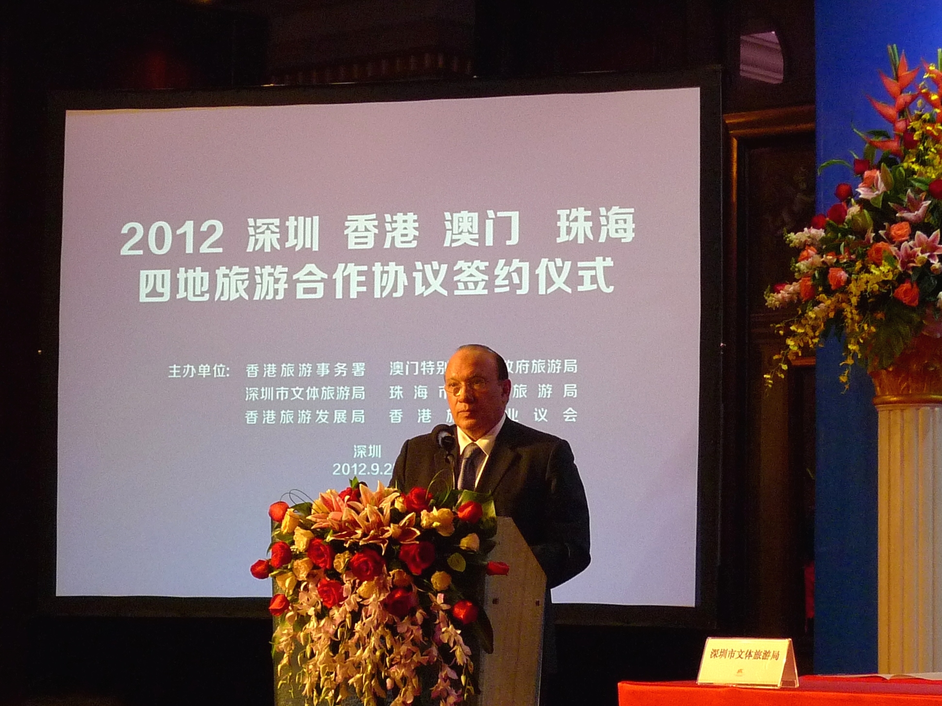 在深圳市市委書記王榮、深圳市市委秘書長李華楠、深圳市市政府副秘書長黃國強、亞洲旅遊交流中心(國家旅遊局香港澳門辦事處)主任徐惠芳、廣東省旅遊局副局長梅其潔,以及香港特別行政區政府旅遊事務專員容偉雄等見証下,澳門特別行政區政府旅遊局局長安棟樑、香港旅遊發展局總幹事劉鎮漢、香港旅遊業議會主席胡兆英、深圳市文體旅遊局局長陳威及珠海市文體旅遊局黨組書記張梅生於本月25日在深圳簽署首份《深港澳珠四地旅遊合作協議》。