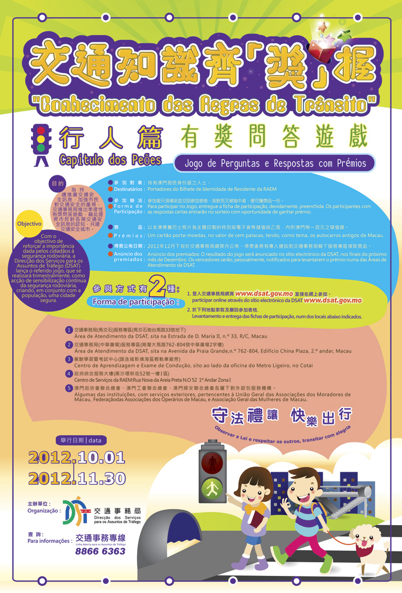 善用過路設施、不要在馬路上嬉戲……以行人出行安全意識為主題的新一期“交通知識齊「奬」握”-有獎問答遊戲即日起接受報名,歡迎市民登入交通事務局網頁www.dsat.gov.mo直接回答問題,或是於指定地點索取參加表格,答對問題即可自動參加抽獎,贏取特別版電子貨幣儲值咭一張,截止期為11月30日。