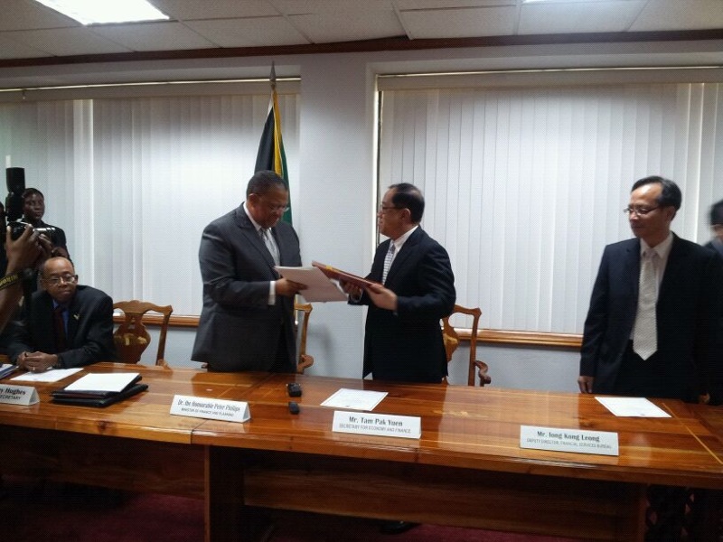 澳門特別行政區與牙買加於二零一二年十月五日在牙買加首都京斯頓簽訂稅收信息交換協定,協定由經濟財政司司長譚伯源代表特區政府簽署。譚伯源在簽署儀式上表示,該協定開啟了兩地互通稅收信息之大門,有助雙方日後加強稅務方面的合作,同時亦彰顯出澳門特區的決心,透過國際合作致力達至高效、透明的國際信息交換標準。在完成相關內部法律認可及相互通知程序後,雙方便可按協定規定要求對方提供所需稅收信息,以協助調查跨境逃漏稅。