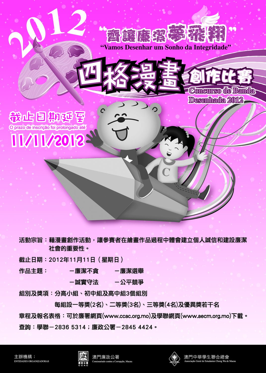 廉政公署與澳門中華學生聯合總會合辦“齊讓廉潔夢飛翔” 四格漫畫創作比賽,原定截止日期為2012年10月21日,期間收到意見反映,基於構思及繪製需時,希望可延長收件日期。主辦單位現徇眾要求,將截止收件日期延至2012年11月11日,歡迎全澳高小、初中及高中學生參加,宣揚廉潔意識。