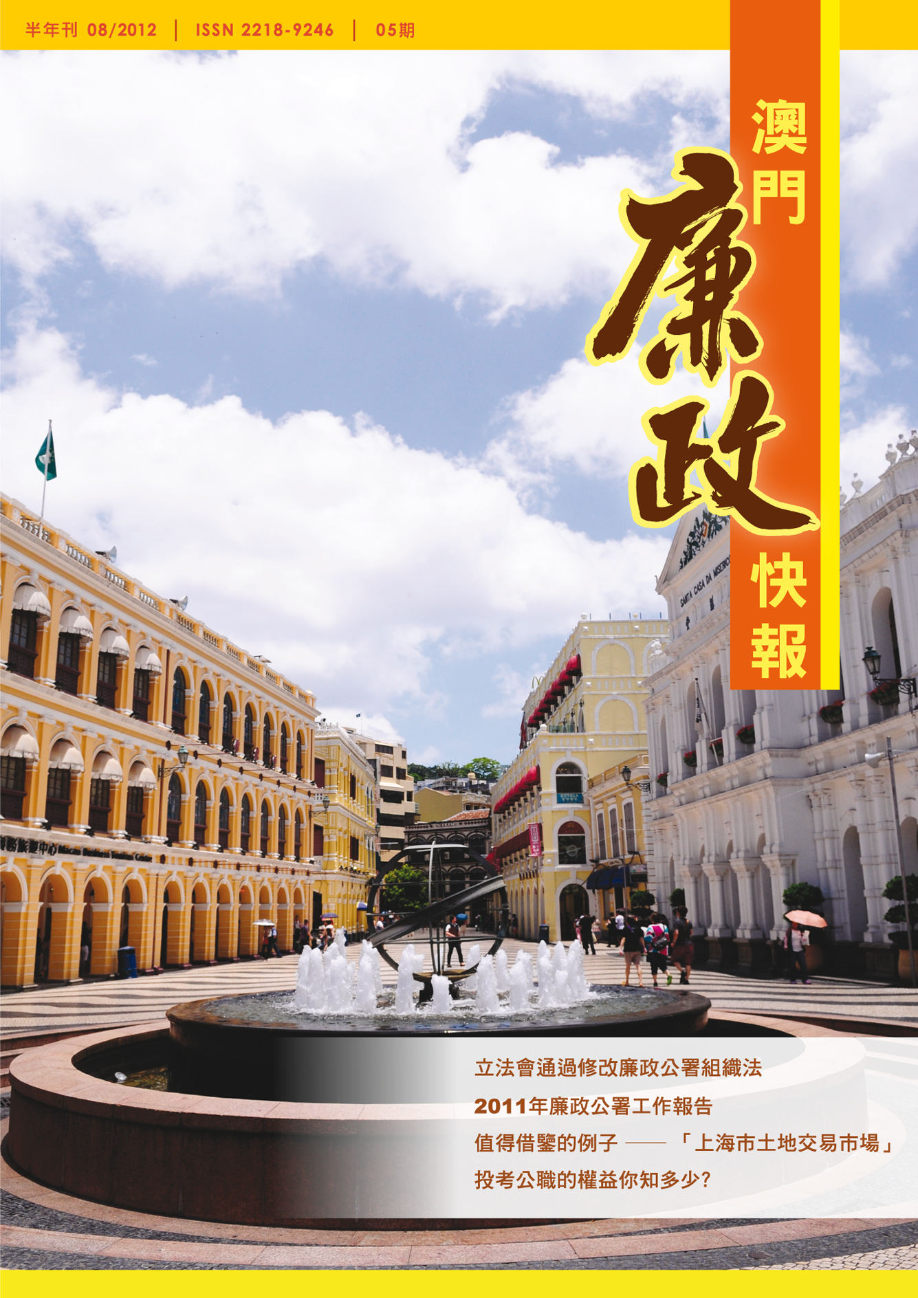 本期《澳門廉政快報》有專文介紹「上海市土地交易市場」,並分析當中提出以「制度加建設」構思的好處。「上海市土地交易市場」是由市政府批准設立的匯集和發布土地交易事務的固定場所,其運作具備公開透明、規範法制和簡便高效三大特點,目的旨在減低人為干擾的可能性,在程序上盡量地防止腐敗的發生。文中指出,澳門現時的土地批給制度基本上已不符合發展的需要,刪刪剪剪的修改根本不能徹底解決各種問題,「上海市土地交易市場」的操作模式及原理值得借鑑。