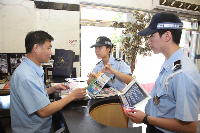 近年本澳商業活動愈見頻繁,商業樓宇亦較以往更有可能成為盜賊光顧的對象,本局對民居與商廈的安全同樣予以高度重視。今日上午,治安警察局公關處副警司黃超文率社區宣傳隊到新口岸一帶進行滅罪宣傳,目的在第四季加強包括商業大廈在內的管理員的防罪意識,做好相關預防工作。