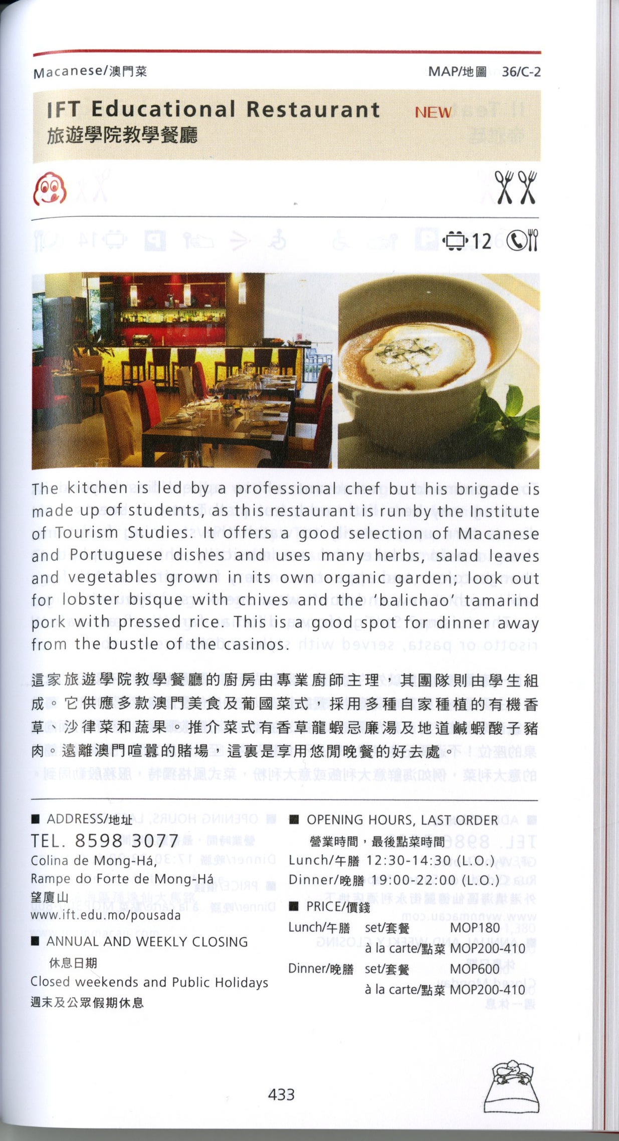 旅遊學院為學生提供學以致用的環境,使其服務質素達到國際水準。餐廳與別不同之處,是在於賓客能體驗到由具國際認證的旅遊學院學生所提供的熱誠與細心服務,當然亦有賴一支由資深廚師組成的專業團隊肩負教導學生及管理的工作。作為一所教學餐廳,本次榮選為2013「米芝蓮車胎人美食」餐廳及由2009年至2012年連續四年獲得著名《米芝蓮指南香港澳門》推薦,不但是對學生們表示出無限支持和鼓勵,同時也成為學院不斷進步的推動力;亦是對旅遊學院教學水平的肯定。每位賓客的蒞臨將帶給學生莫大的支持和鼓勵,同時為培育澳門旅遊業人才作出貢獻。
