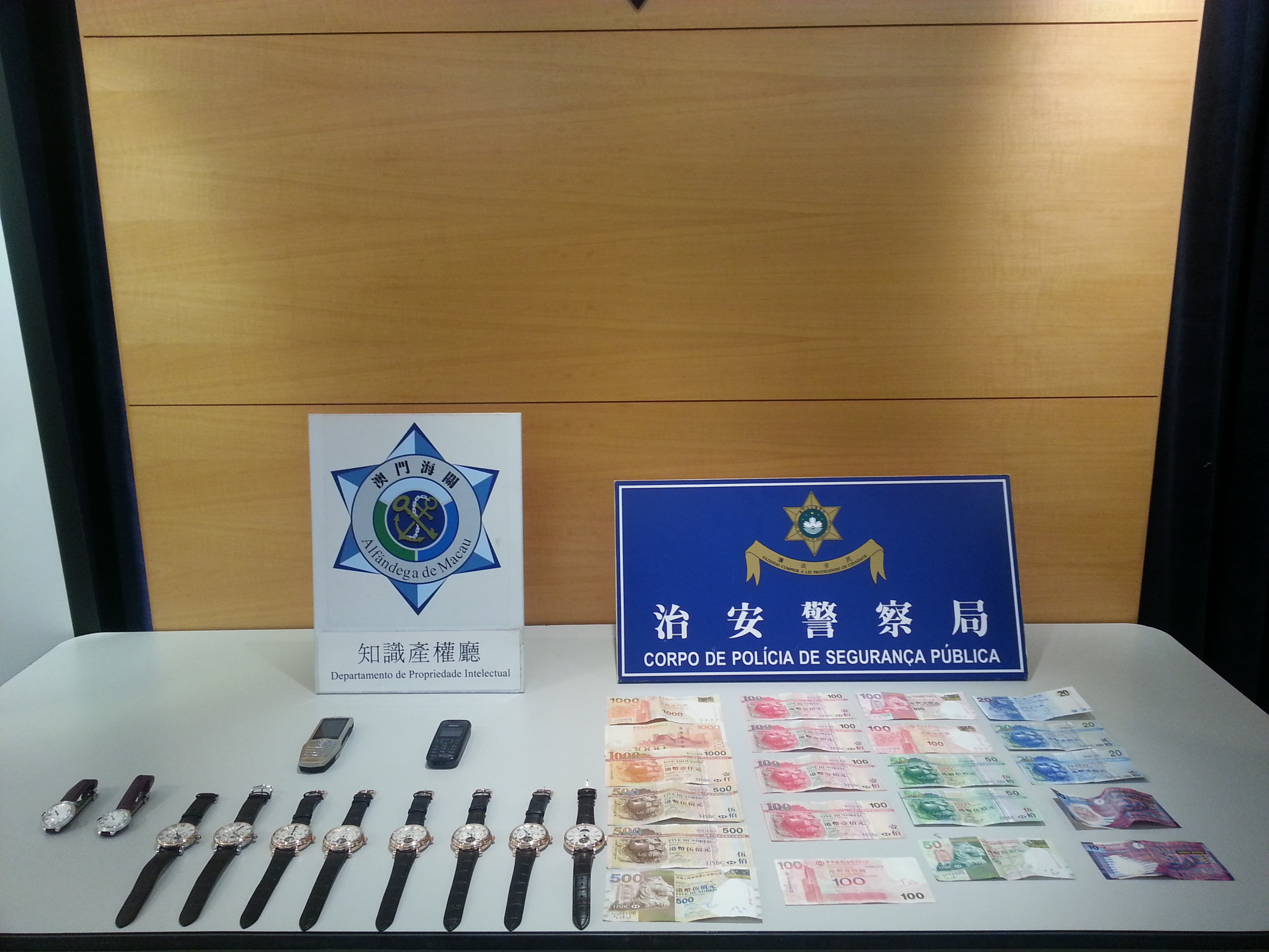 治安警察局第三警務警司處警員在中區某酒店娛樂場內,查獲一名男子正在向場內人士兜售手錶,並即場在嫌犯身上查獲十隻涉嫌冒牌名貴手錶,包括有“VACHERON CONSTANTIN”、“CARTIER”及“IWC”等品牌。案件透過既定的合作機制,即時聯合海關共同偵查處理。有關物品外觀雖然仿真度極高,但並沒有任何包裝和出廠票據,貨品來歷存疑。海關隨即展開深入調查,並核實該等品牌商標已在澳門特區政府經濟局作出合法註冊登記,在獲得有關品牌權利人代表的初步認證,上述貨物均為外表高仿膺品。