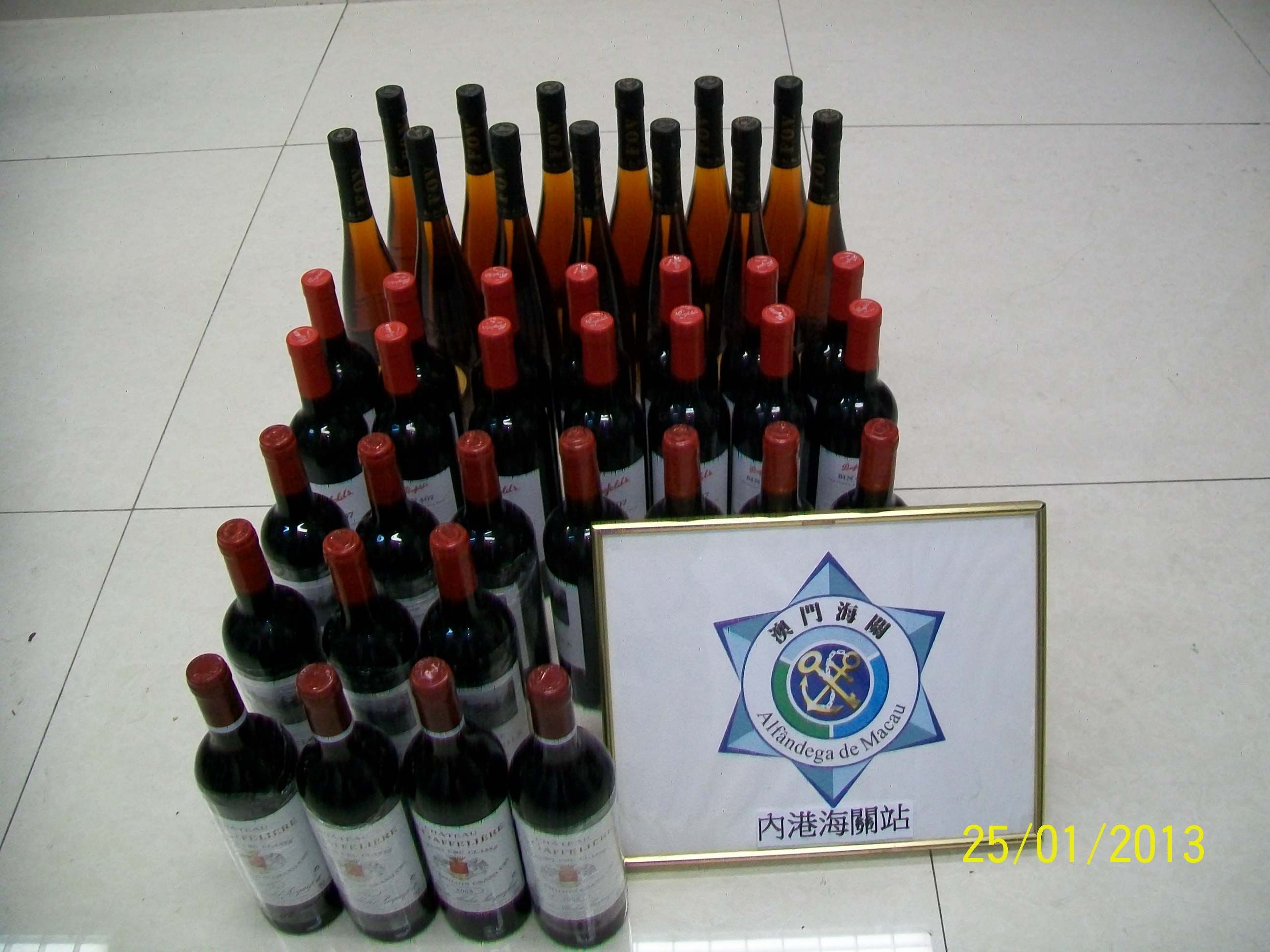 澳門海關在內港一帶巡查行動中,海關口岸監察廳和海上監察廳關員於日前(25日)在內港5B2碼頭內及7號碼頭對出海面共檢獲13支洋酒 和43支紅酒,估值約澳門幣7萬元。