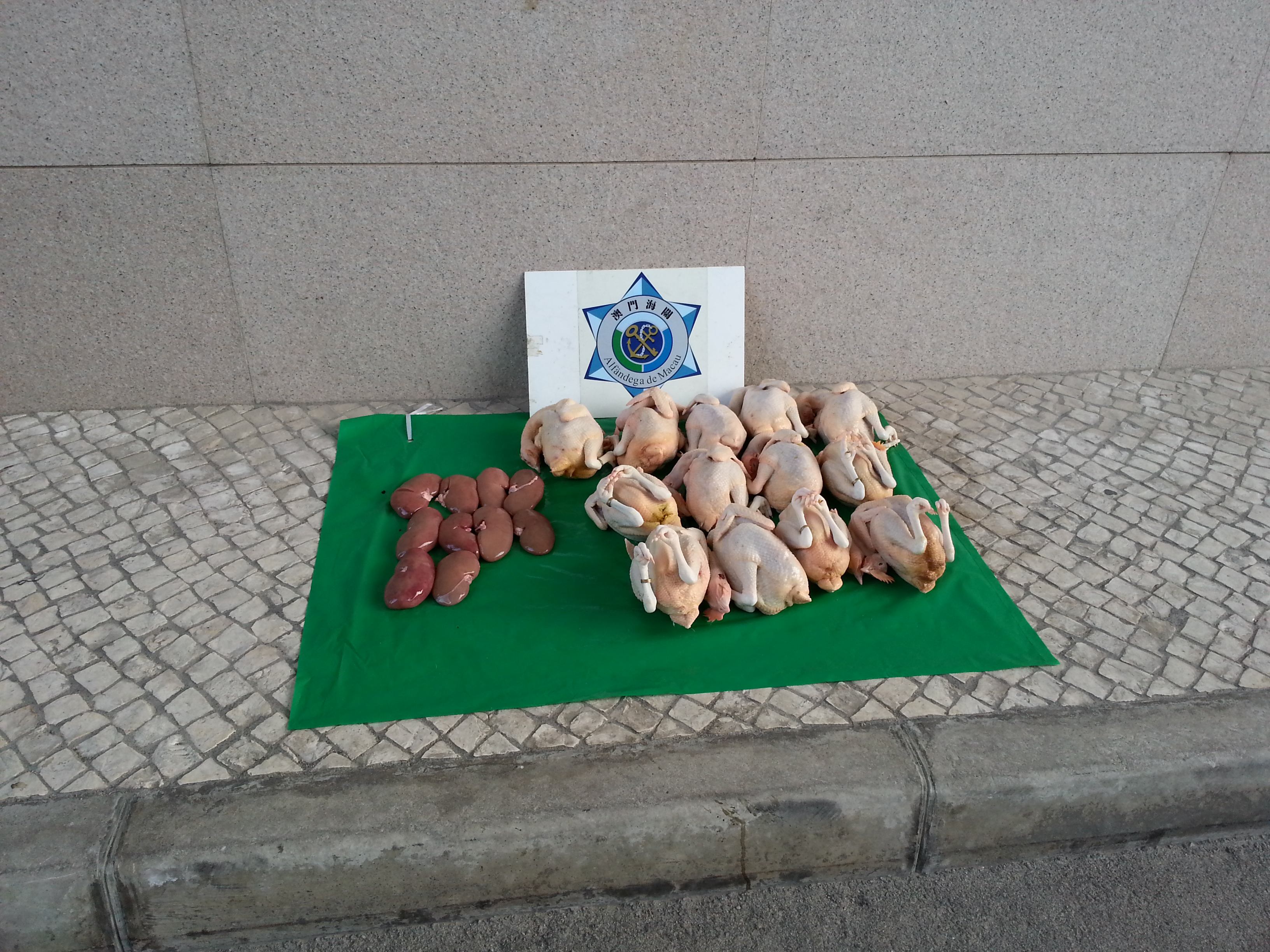 於今天早上7時,關員發現有水客將從內地帶回之物放置於台山如意閣附近,其後,一名男子到場整理有關物品,關員上前截查,檢獲一批未經檢疫已宰家禽。該名男子聲稱該批家禽是以澳門元100元帶工費透過一名水客帶回本澳,並準備運往新口岸售予「x記葡國餐廳」作食材之用。是次行動,經點算後,共緝獲已宰鮮雞及雞內臟共14公斤、水鴨8公斤及乳鴿3公斤。