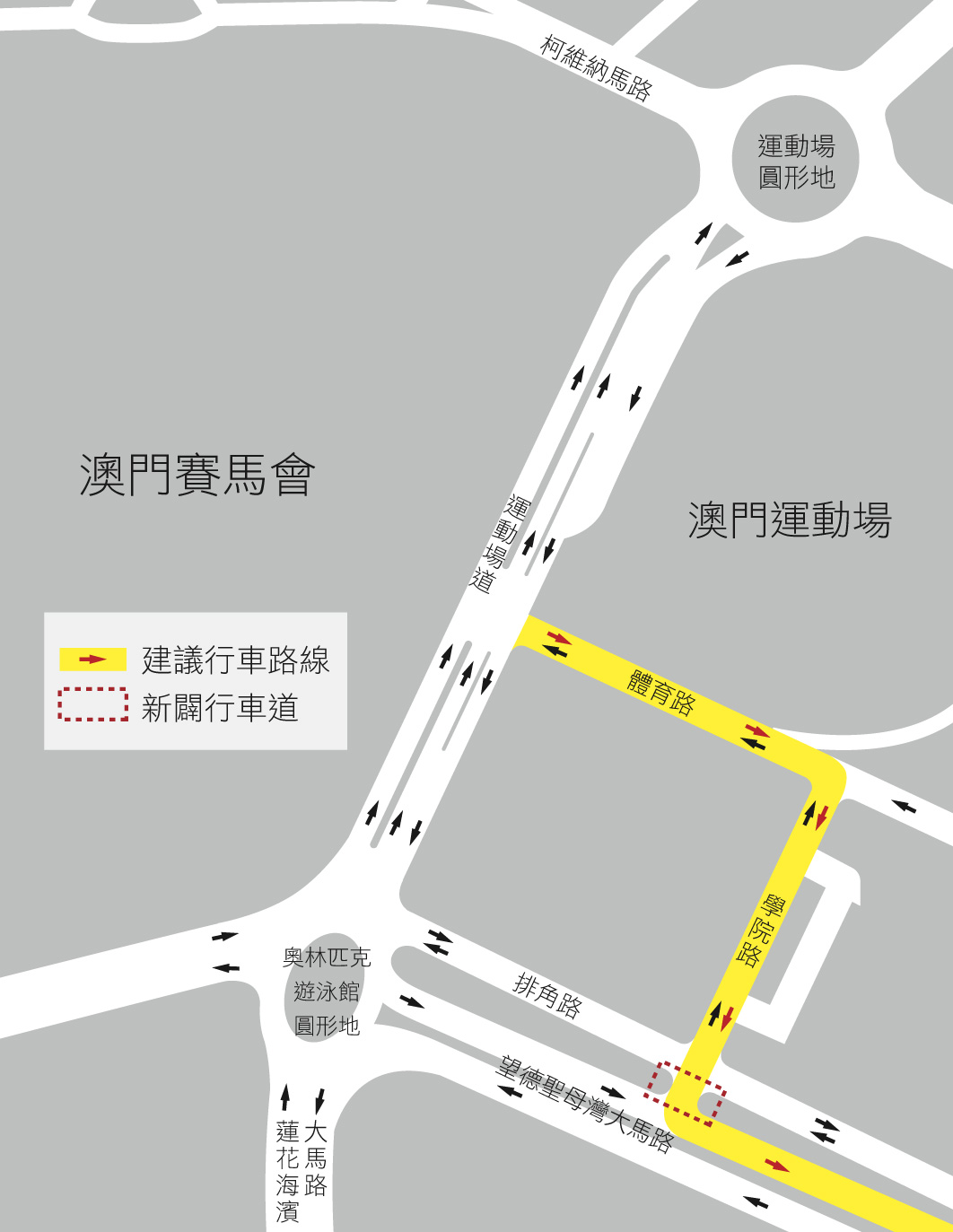 為此,交通事務局早前已完成開通位於學院路與望德聖母灣大馬路交界的綠化帶,並新闢三條行車道,包括一條左轉往路氹城方向及兩條右轉往澳門方向的車道。因考慮到現時繁忙時段運動場道附近一帶路段的交通壓力,交通事務局今 (6日)上午11時起首先開通一條左轉車道,即由學院路貫穿排角路通往路氹城方向的車道,餘下兩條右轉車道則會在日後配合未來運動場道的輕軌工程而開通。隨著通往路氹城方向的新車道開通,經氹仔市中心往路氹城區的駕駛者,可選擇從奧林匹克大馬路、運動場道、體育路、學院路後,經新車道左轉望德聖母灣大馬路向路氹城方向行駛。