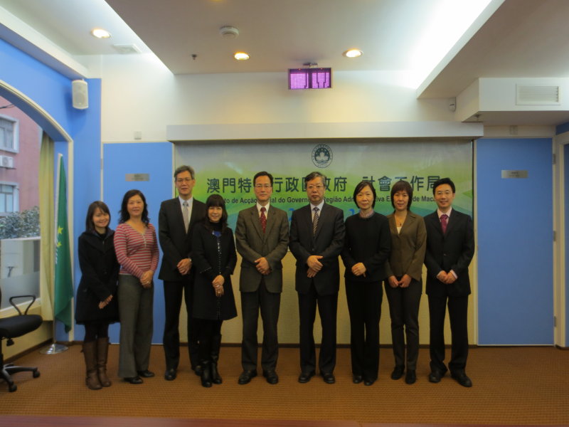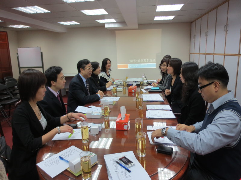及後到訪社會工作局,獲容光耀局長、黃艷梅副局長、社會互助廳蔡兆源廳長、長者服務處羅淑霞代處長等人接待。會上,代表團成員聽取有關澳門特區長者服務現況及未來規劃,以及澳門養老保障機制十年規劃研究的介紹,雙方就安老服務和養老保障等議題進行交流。
