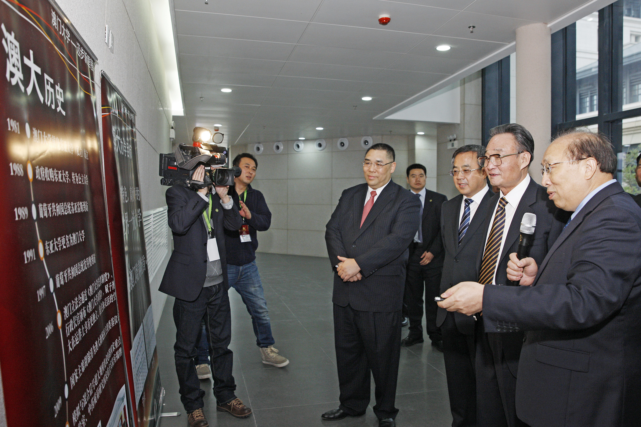 陪同視察澳大新校園的有廣東省委書記胡春華、全國人大常委會副委員長周鐵農、澳門特別行政區行政長官崔世安、廣東省省長朱小丹、全國人大常委會副秘書長喬曉陽、社會文化司司長張裕、澳門大學校董會主席謝志偉等。