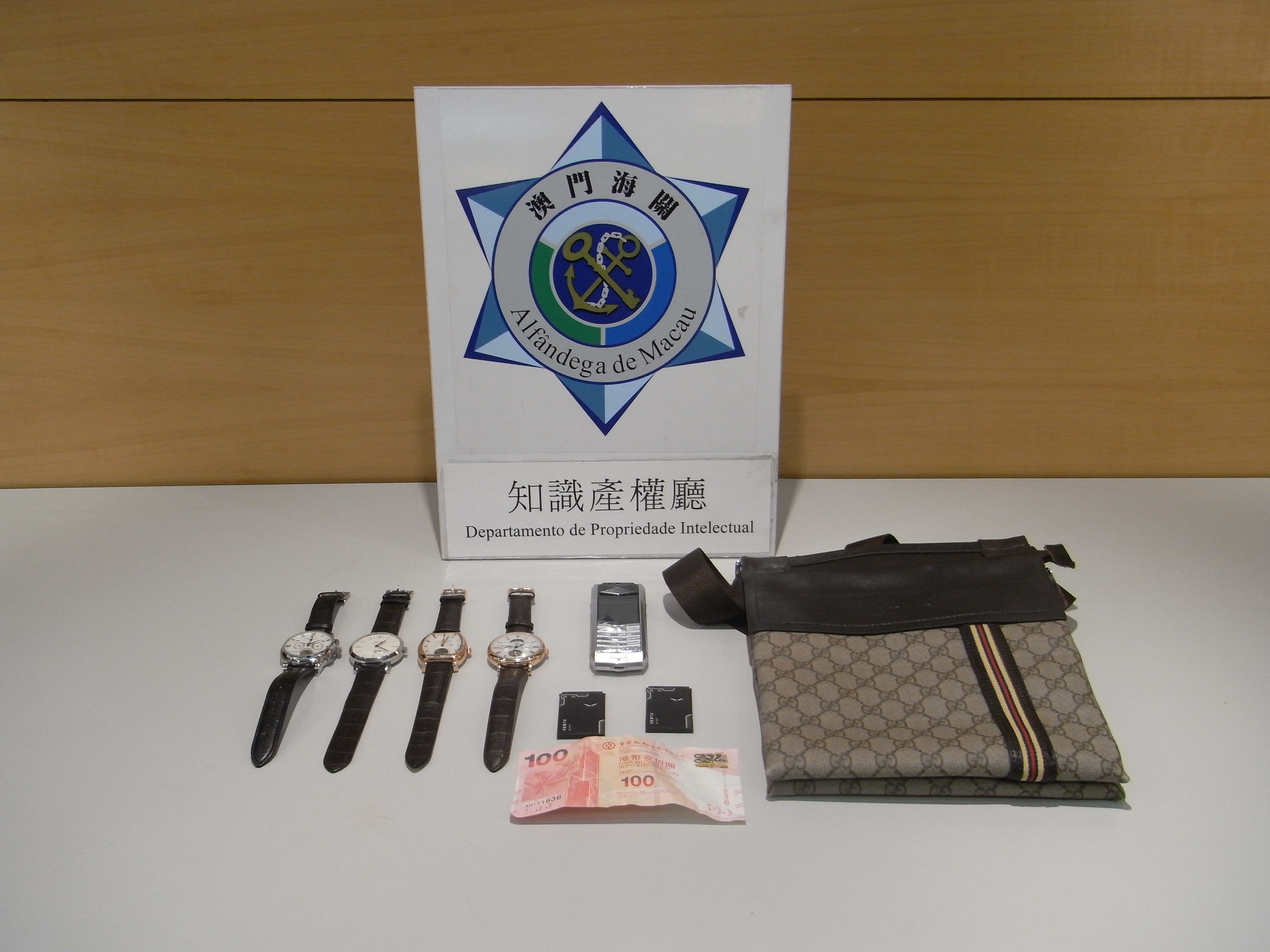 於二月二十八日下午,中區一名準備上班的酒店保安員,行經酒店門口時,親證一名男子向在場人士兜售手錶等物,遂立即通知上級,向海關及治安警察局求助,兩部門根據酒店保安人員提供資料,立即分工合作,展開深入調查,海關知識產權廳偵查人員迅速到達現場,在得到該酒店保安部門的全力協助下,即場在嫌犯身上搜獲四隻懷疑為贗品的名牌手錶,牌子分別為:「VACHERON CONSTANTIN」、「PIAGET」、「PATEK PHILIPPE」及「IWC」品牌各一隻,一個涉冒「GUCCI」品牌商標的手袋和一部標示有「VERTU」商標之手提電話連配件。相關人士及物品被帶返海關總部作後續跟進,有關物品除先由海關資深偵查員作現場初步認別外,繼而轉由品牌權利人代表作進一步鑑定,初步核實涉案證物為假冒偽劣品。