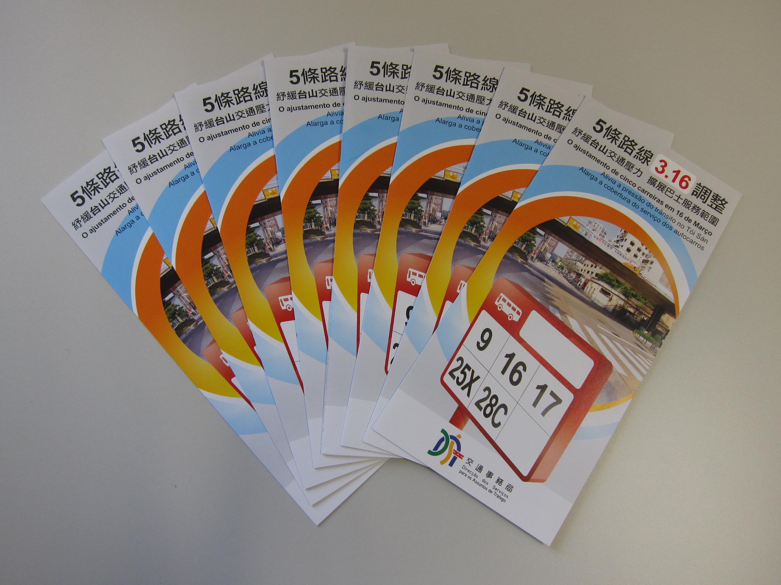 為方便乘客熟習新路線及調整路線的安排,是次巴士路線調整初期,交通事務局將安排交通輔導人員在相關巴士站派發宣傳單張及提供巴士路線諮詢服務,局方並印製了相關宣傳單張,歡迎公眾到交通事務局服務專區、政府資訊中心索取;同時,亦可登上www.dsat.gov.mo瀏覽有關資訊。