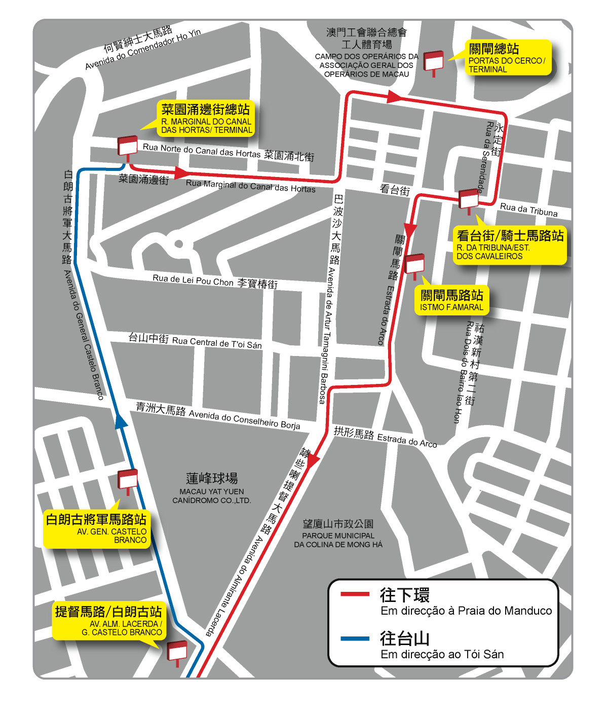 因應台山白朗古將軍馬路及李寶椿街經已貫通,為紓緩周邊的巴波沙大馬路及關閘馬路等道路的交通壓力,並利用新闢道路加快周轉以提升班次,同期還將調整原來行經上述道路的16及25X路線;其中,16路線按原線行駛至停靠“雅廉訪/聖心”站後,將改為停靠“提督馬路/白朗古”站、“白朗古將軍馬路”站至“菜園涌邊街總站”,取消途經巴波沙大馬路、何賢紳士大馬路。而往氹仔方向的25X路線,從“關閘總站”開出後,將改為停靠“街總社區服務大樓”站、“白朗古/跑狗場”站後,按原線行駛,取消途經看台街、關閘馬路、三角花園;至於往關閘方向的25X路線,按原線行駛至“白朗古將軍馬路”站後,將改為停靠“菜園涌邊街總站”後返回 “關閘總站”,取消途經台山街市、巴波沙大馬路。