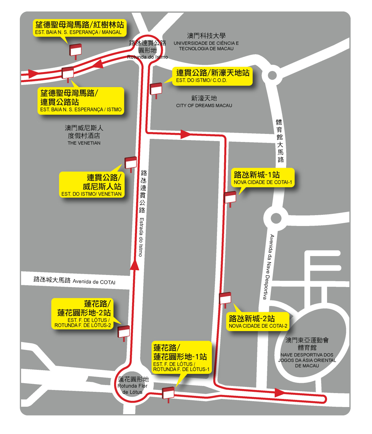 與此同時,為提升巴士路線覆蓋率,25X路線還將調整途經路氹新城的新開闢路段(介乎於路氹連貫公路與體育館大馬路之間的區域,即金沙城中心後門),並於該路段新增設“路氹新城-1"站及“路氹新城-2"站,方便市民前往該區。調整後,25X路線將不停靠“連貫公路/金沙城中心"及“蓮花圓形地-1"站,改為停靠上述新增兩站及“蓮花路/蓮花圓形地-1"站。