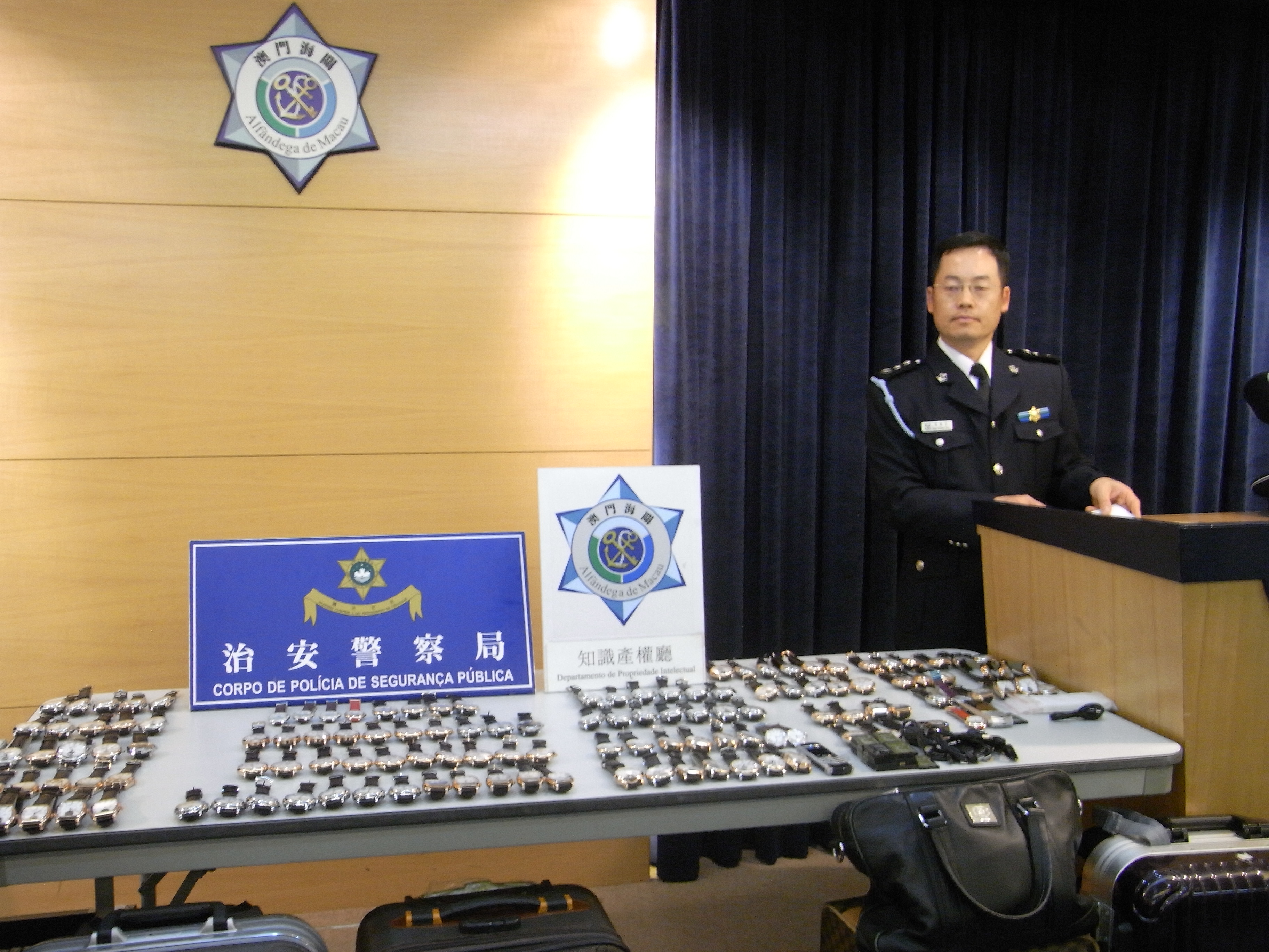 澳門海關及治安警察局持續聯手在社區進行防罪滅罪,於三月十二日,在皇朝區街頭,治安警截獲一名正在向途人兜售涉嫌侵權偽冒手錶的外地男子,在海關知識產權廳跟進偵查後,在中區一單位內搜獲一批侵權貨物,相信已搗毀一假貨存取窩點。