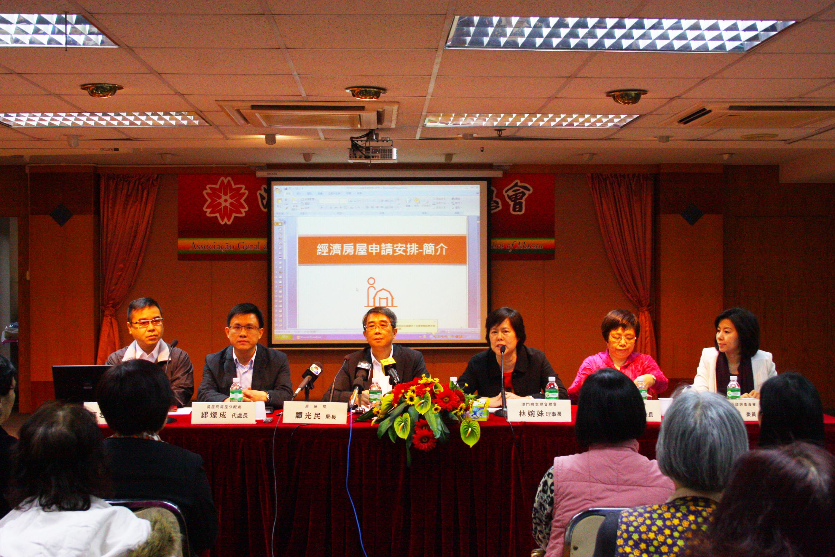 房屋局局長譚光民、房屋分配處代處長繆燦成等於3月22日向澳門婦女聯合總會介紹即將於3月27日展開業興大廈1,544個一房一廳經屋單位之公開申請情況,該會理事長林婉妹、副會長胡婉平以及該會會員出席。
