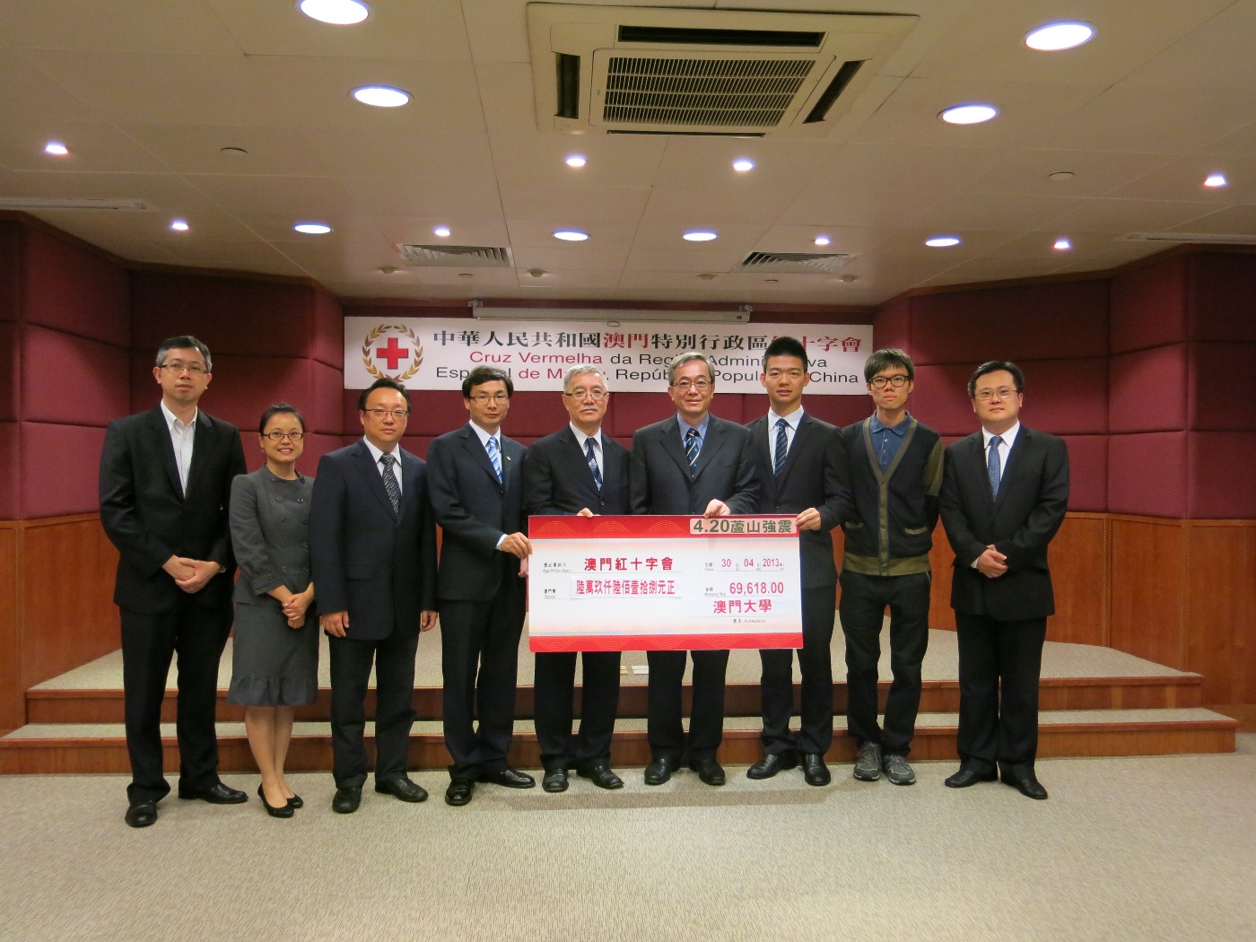 澳大副校長(學生事務)程海東教授、傳訊總監張惠琴、研究生會理事長馬志橋、內地生會會長孟君澤、學生會社會事務部部長方海金和校友會副主席王世民代表全校師生職員向澳門紅十字會遞交捐款,該會理事長馬建華、司庫梁偉銓和委員梁頌衍代表接收。程海東教授表示,是次籌款活動學生的參與度非常高,可謂眾志成城,他們落力的籌款行動值得鼓勵。發起人之一的孟君澤表示,活動頭兩天已籌得近兩萬元,對全校同心合力籌款感到動容,特別是在悼念燭光晚會上看到不同國籍的同學參與,令他感動不已。