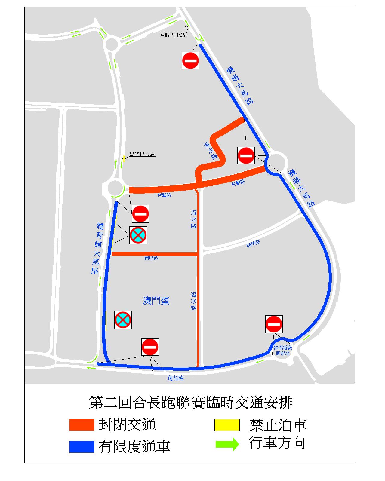 配合上述活動需要,網球路、溜冰路及射擊路於當日(26日)清晨5時至10時實施封閉交通;同時,介乎射擊路與蓮花路之間的一段體育館大馬路、介乎體育館大馬路與路環電廠圓形地之間的一段蓮花路,以及介乎路環電廠圓形地與霍英東博士大馬路之間一段機場大馬路(即體育館大馬路、蓮花路及機場大馬路靠向澳門東亞運動會體育館的一側車行道)會實施有限度通車,期間相關路段亦會禁止車輛停泊。