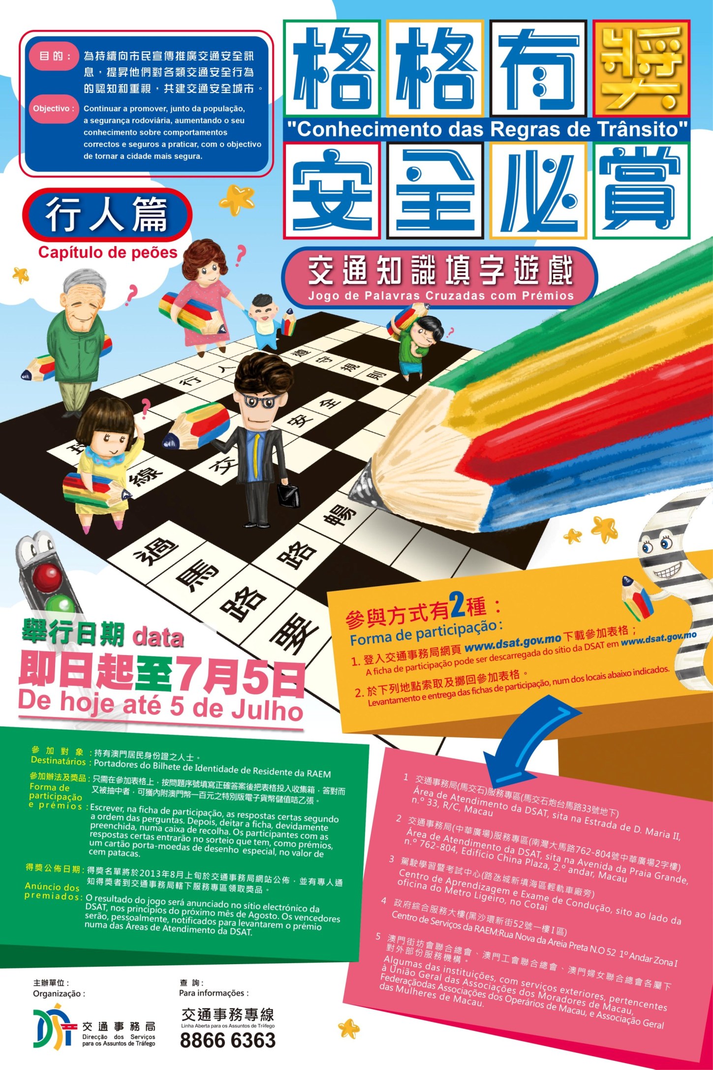 交通事務局推出全新活動--「格格有獎,安全必賞」交通知識填字遊戲活動,由即日起至7月5日,市民可前往交通事務局服務專區等多個指定地點索取參加表格,或是登入交通事務局網頁www.dsat.gov.mo下載,填妥後交回相關地點,答對問題即可自動參加抽獎,贏取內附澳門幣一百元之特別版電子貨幣儲值咭,名額50名。