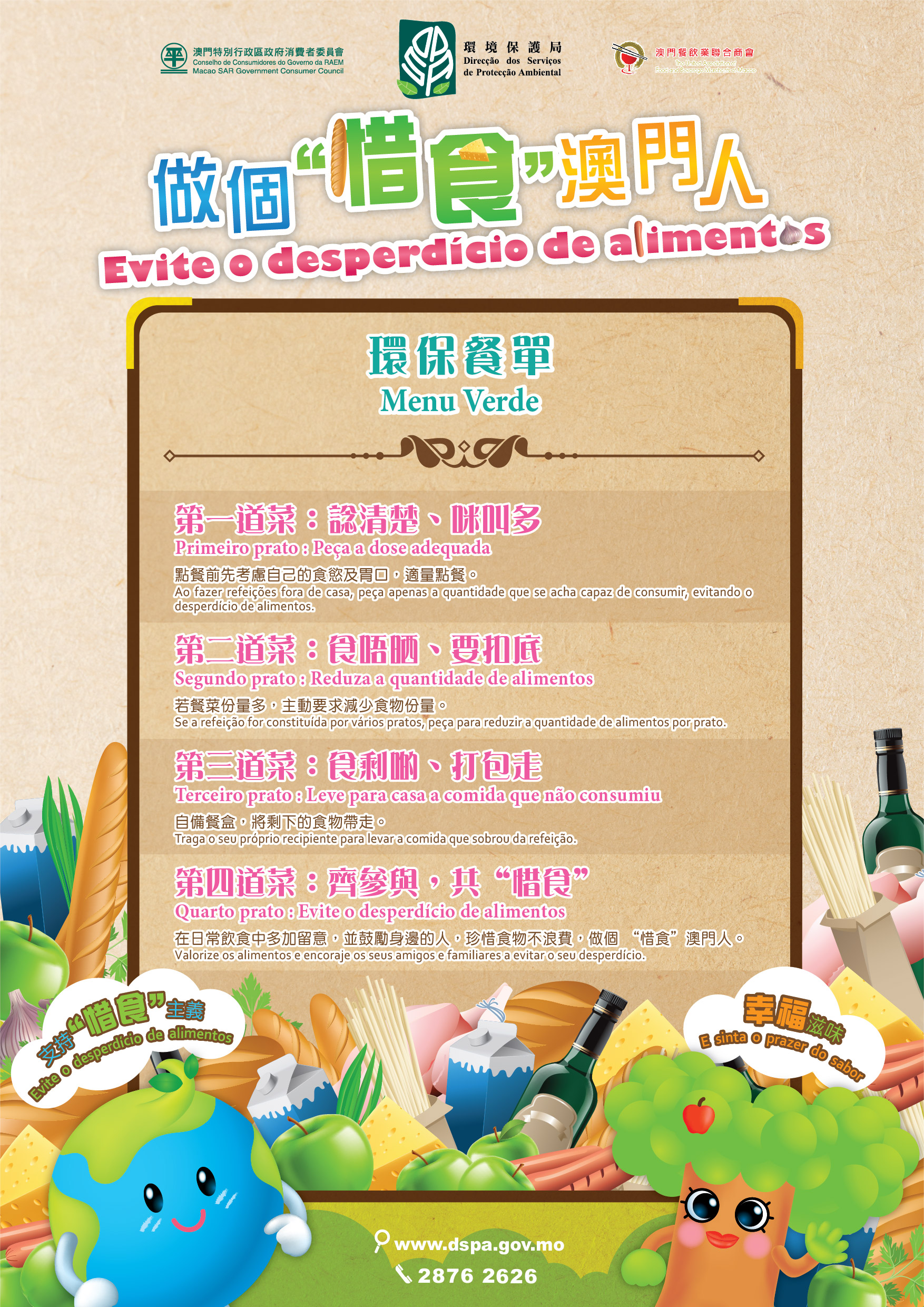 每年6月5日為世界環境日,而今年聯合國環境規劃署所公佈的世界環境日主題是Think‧Eat‧Save(“思前‧食後‧勵行節約”)。據聯合國糧食和農業組織(FAO)的調查,每年約有13億噸的食物被浪費,約佔全球糧食生產的三分之一;同時,世界上有七分之一的人正在遭受飢餓,每天超過2萬名5歲以下的小童死於飢餓。為此,作為地球村的一份子,環境保護局與消費者委員會以及澳門餐飲業聯合商會合作,向本澳的飲食業界推動珍惜食物之工作,並鼓勵市民大眾外出用餐時,首選四道菜: