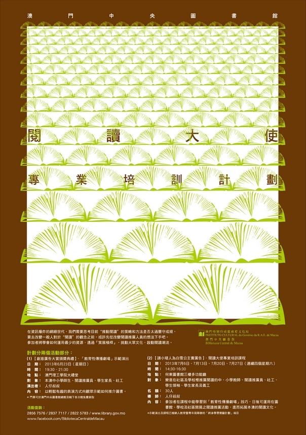 “教育性傳播劇場”示範演出活動將於六月二十三日(星期日)晚上七時三十分假澳門理工學院大禮堂舉行,門票由即日起可於澳門中央圖書館總館及轄下各分館免費索取,每人上限五張。數量有限,派完即止。“閱讀大使專業培訓課程”由七月六日起連續四個周六下午二時三十分至四時三十分在何東圖書館舉行。完成四堂課的參加者將獲發出席證書。課程費用全免,額滿即止,報名可親臨澳門中央圖書館總館 (荷蘭園大馬路八十九號 A-B)或何東圖書館(崗頂前地三號)辦理。有關示範演出活動及培訓課程均已被納入教育暨青年局 “終身學習獎勵計劃”項目。詳情查詢可於辦公時間內致電二八五六七五七六/二八三七七一一七。
