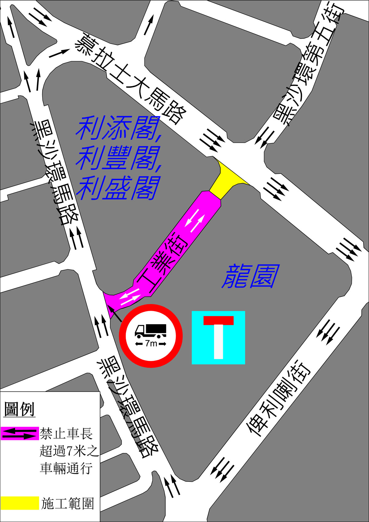 配合自來水公司更換地下石棉水管,介乎黑沙環馬路及慕拉士大馬路之間的一段工業街,由周二(18日)上午10時起改為無出口道路,並禁止車身長度超過7米之車輛由黑沙環馬路轉入工業街,工期約10日。期間,18A路線需改道行駛,原線停靠之巴士站點則維持不變。