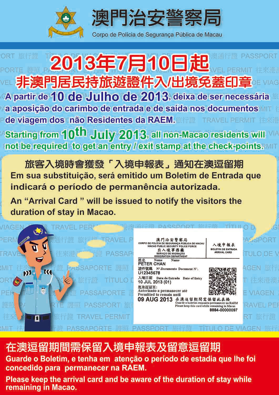 本局將於本年7月10日起全面實施出入境免蓋章措施,所有旅客持旅行證件及護照經本澳各邊境口岸出入境無需蓋章,旅客在准予入境時會獲發一張電腦打印的入境申報表,以取代過往在證件上的蓋章;同樣在出境時亦不會在其證件上蓋章。