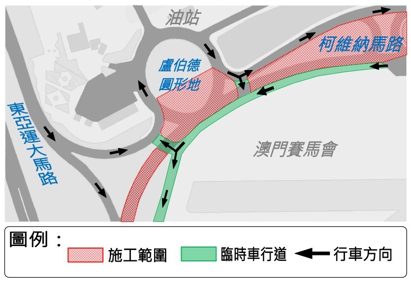 為盡快優化氹仔柯維納大馬路一帶的下水道管網,政府正加緊進行柯維納大馬路至東亞運大馬路的下水道擴容工程。為推進有關工程的興建,政府將澳門賽馬會靠近盧伯德圓形地的地塊闢作臨時路,以疏導由馬會往西灣大橋方向的車輛。有關臨時路建造工程已於日前竣工,並將於明天(7月8日)通車,屆時,駕駛者可取道澳門賽馬會近盧伯德圓形地的新闢臨時路行駛。