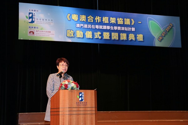 由澳門特別行政區政府教育暨青年局主辦、澳門文物大使協會協辦的“澳門居民在粵就讀學生學費津貼計劃”啟動儀式暨開課典禮,於七月十六日在澳門中葡職業技術學校禮堂舉行。出席活動的嘉賓包括中央人民政府駐澳門特別行政區聯絡辦公室徐婷副部長、教青局局長梁勵、社會文化司司長辦公室顧問惠程勇,以及澳門文物大使協會副理事長吳芷敏等。