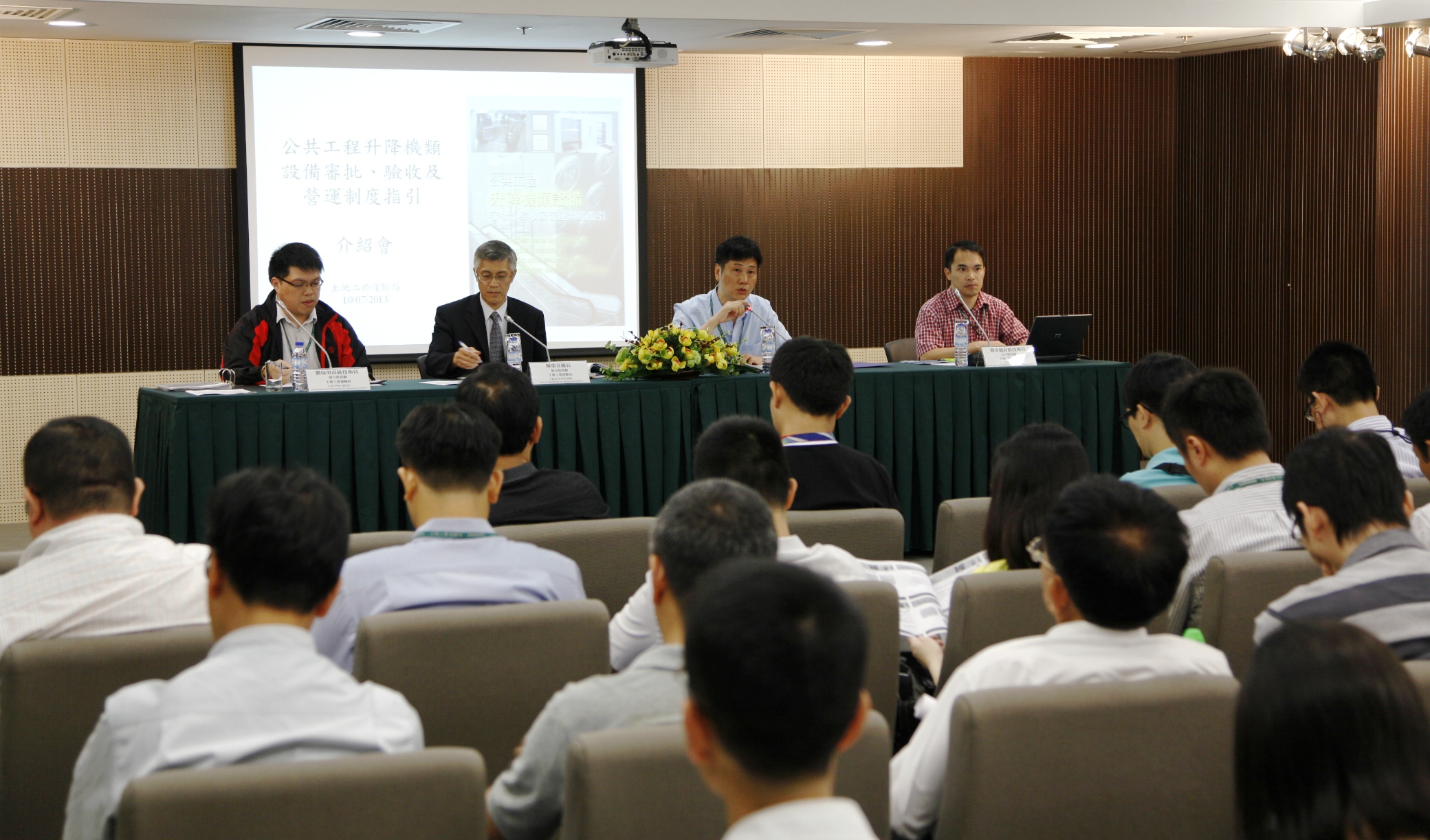 “公共工程升降機類設備審批、驗收及營運制度指引”介紹會日前(10日)於土地工務運輸局多功能室舉行,由副局長劉振滄及城市建設廳廳長陳榮喜等主持,來自多個部門共數十位相關範疇的公務人員出席。