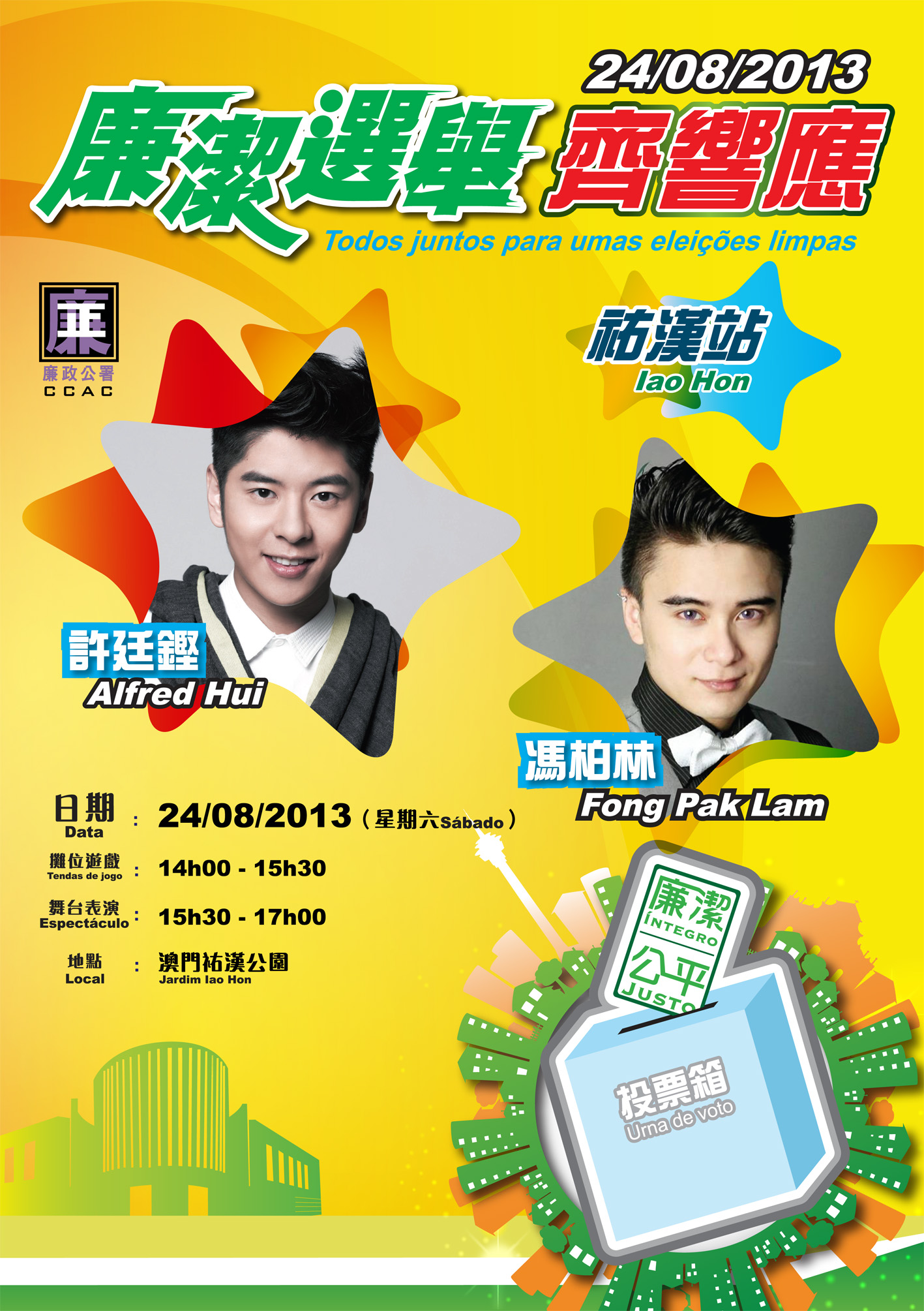 為配合9月15日舉行的澳門特別行政區第5屆立法會選舉,廉政公署將於8月24日下午2時至5時在祐漢公園舉行「廉潔選舉齊響應─祐漢站」綜藝表演活動,藉此進一步向市民傳遞廉潔選舉的訊息。歡迎市民踴躍參與,齊來響應廉潔選舉。