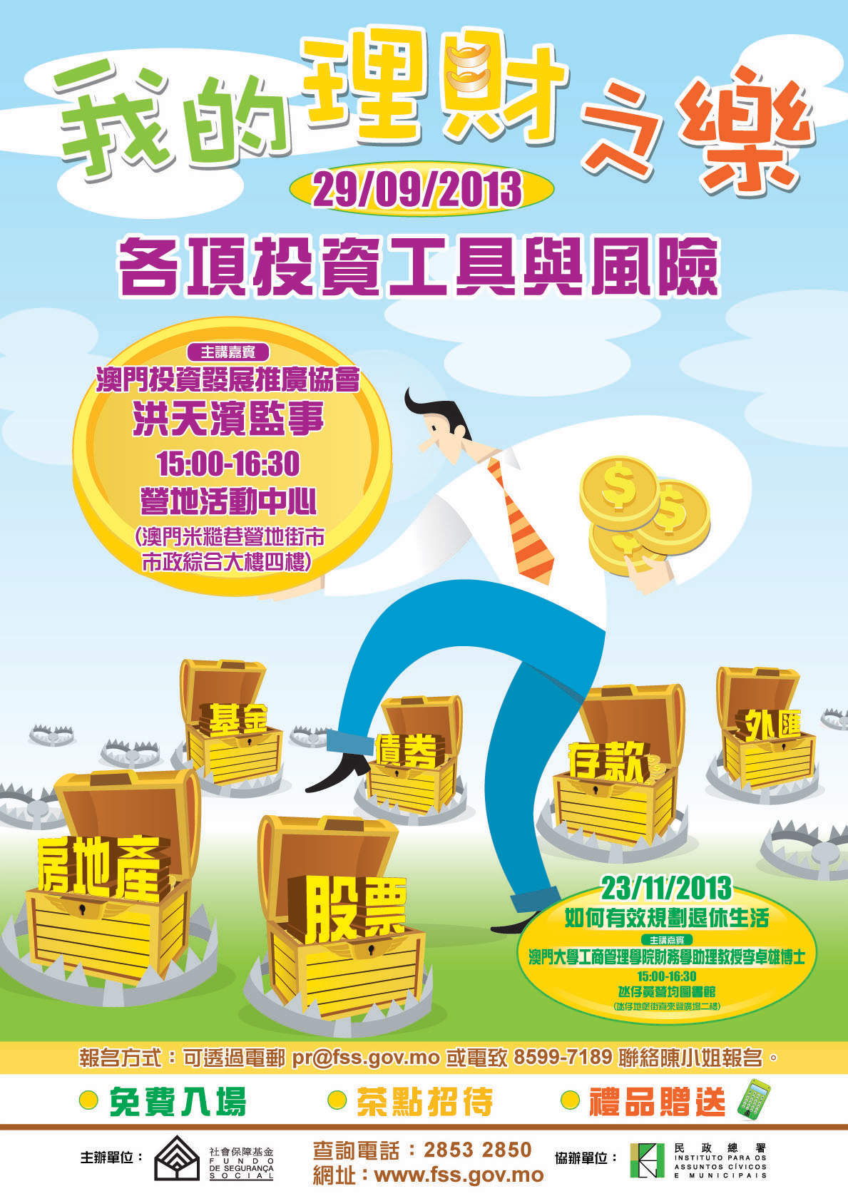 有興趣的人士可於辦公時間致電85997189報名,或郵寄姓名、出席人數和聯絡電話至pr@fss.gov.mo。活動名額有限,額滿即止,詳情可瀏覽社保基金網頁www.fss.gov.mo。
