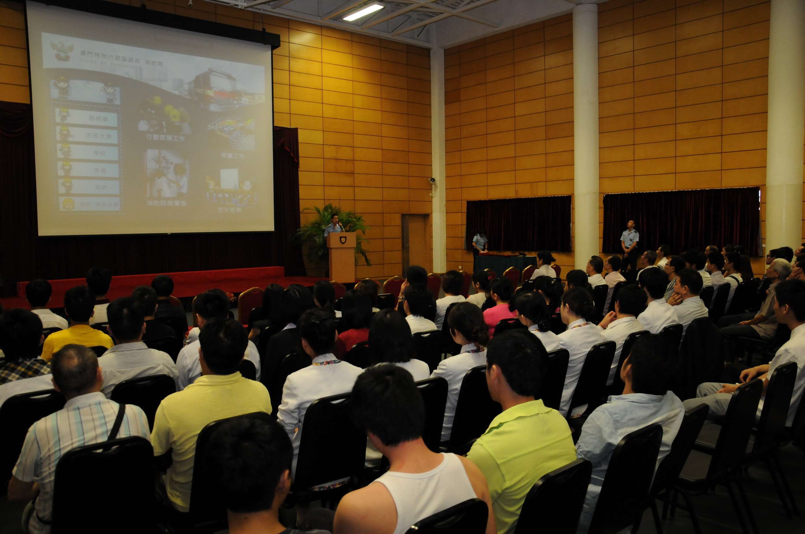 消防局於2013年10月08日,在消防局總部暨西灣湖行動站為澳門餐飲業聯合商會舉辦了一場消防安全知識培訓課程,商會共有150人參與。