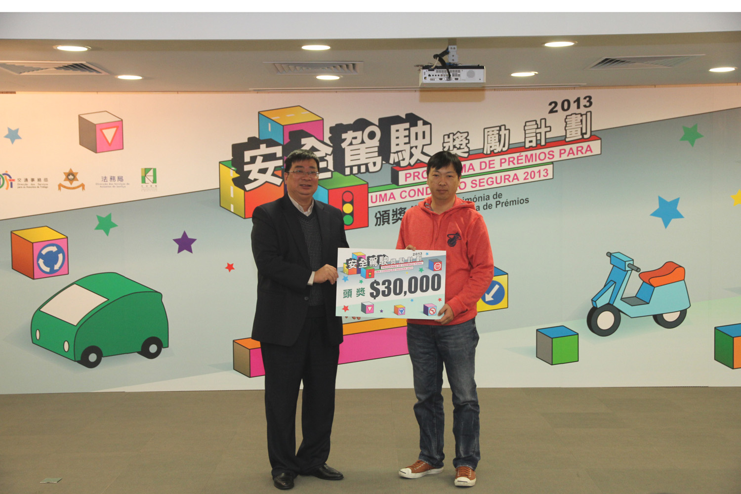 「安全駕駛獎勵計劃2013」頒奬儀式日前舉行,主辦單位向頭三奬共九名得奬者頒發奬金,餘下得獎者可於12月31日前,憑澳門居民身份證或駕駛執照前往交通事務局(馬交石)服務專區領獎。另外,新一期「安全駕駛獎勵計劃」正接受報名,歡迎駕駛者踴躍報名參加。