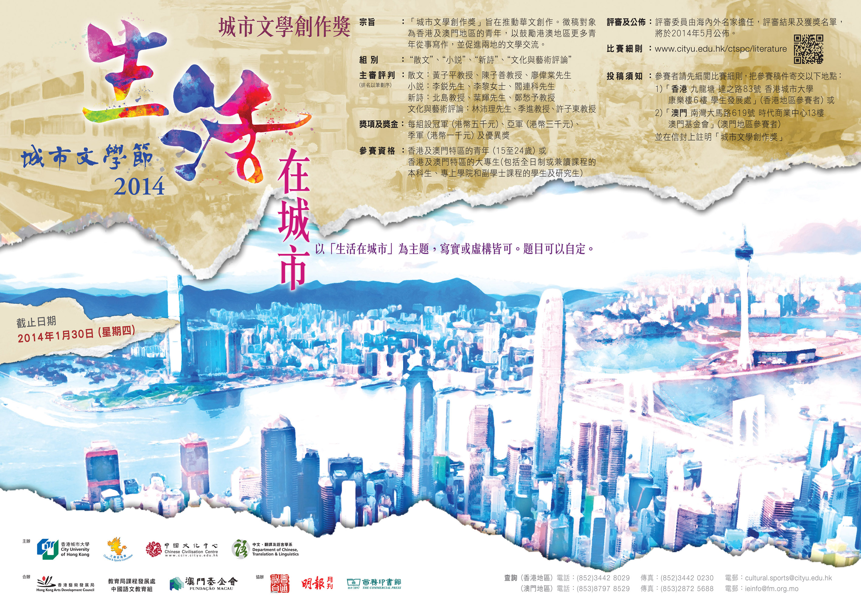 由香港城市大學主辦,澳門基金會、香港藝術發展局及香港教育局課程發展處中國語文教育組合辦的“城市文學節2014”系列活動之“城市文學創作獎”現已接受投稿,凡年齡界乎15至24歲的港澳地區青年或就讀兩地高等教育學位課程的學生(包括全日制及兼讀制的專科、本科或研究生課程學生)均可由即日起至2014年1月30日期間投稿,獲獎名單將於2014年5月公佈,所有獲獎作品並將結集出版。