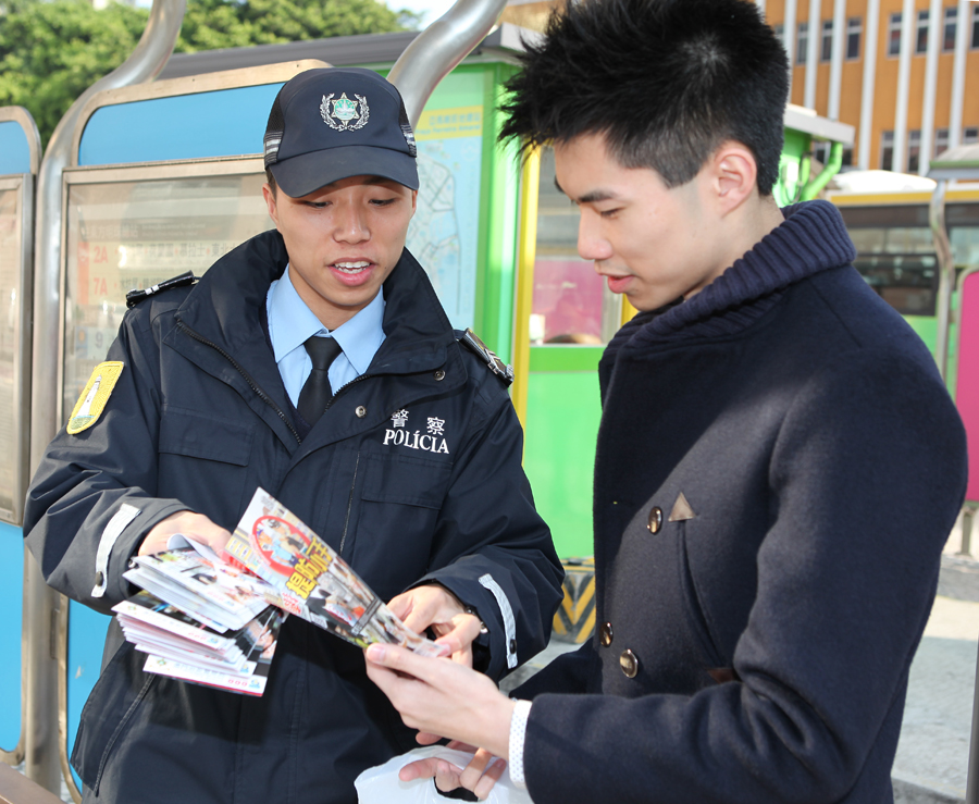 今天上午,澳門警務廳聯同公關處到殷皇子大馬路、新馬路、亞馬喇前地一帶巴士站及轉乘點進行防扒宣傳,向途人、候車乘客及站長派發“提防小手”小冊子、提醒防範扒竊手法及管好財物,市民旅客紛紛停駐索取宣傳資料。