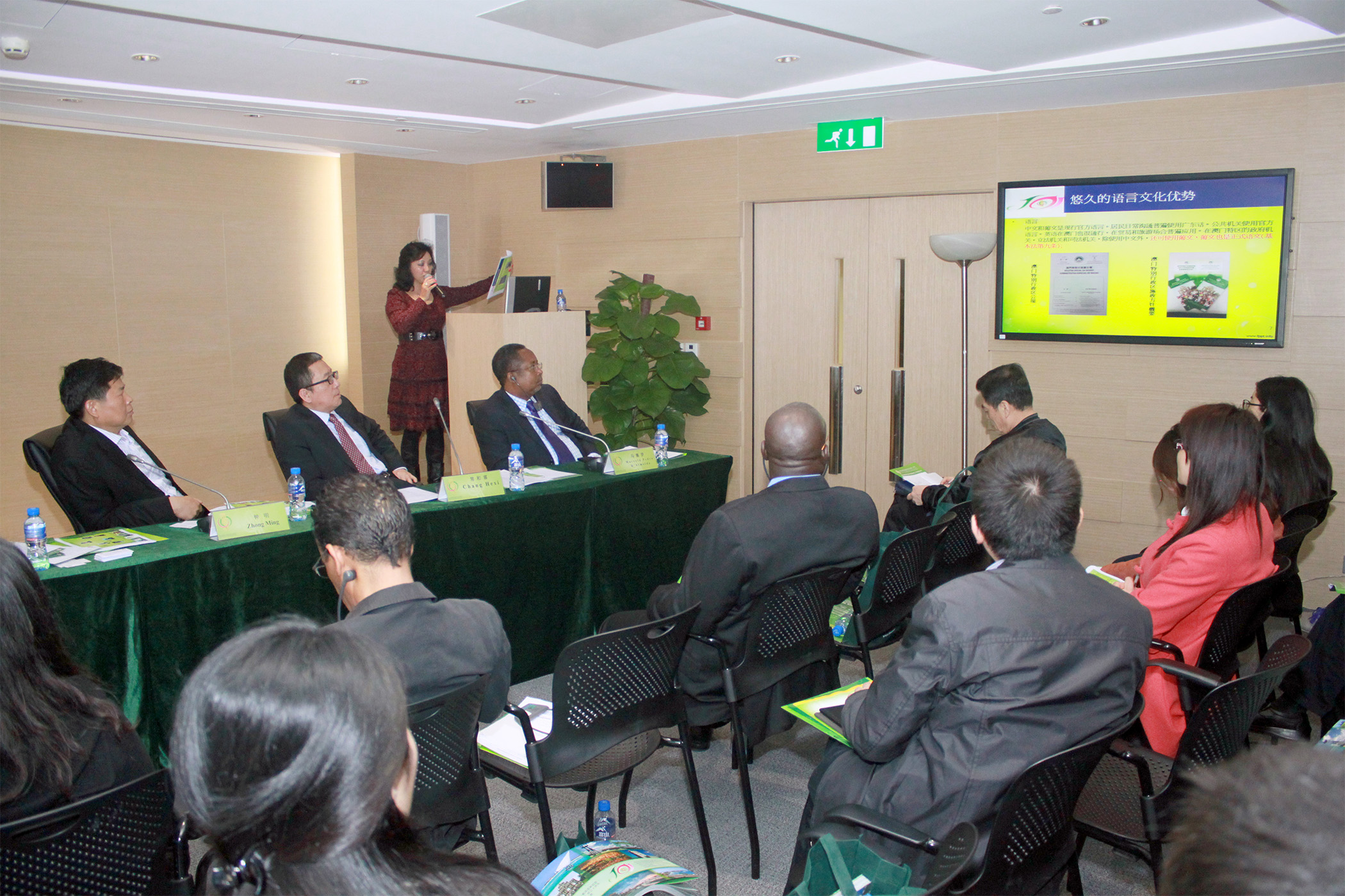 中葡論壇常設秘書處常和喜秘書長丶馬塞羅副秘書長(葡語國家代表)丶姍桃絲副秘書長(澳門特區政府代表)、行政辦主任張杰丶佛得角派駐代表馬里奧‧文森特、幾內亞比紹派駐代表馬立文及莫桑比克派駐代表埃斯梅拉爾達等出席交流。會上, 常和喜秘書長丶鍾明團長丶馬塞羅副秘書長及姍桃絲副秘書長分別介紹。