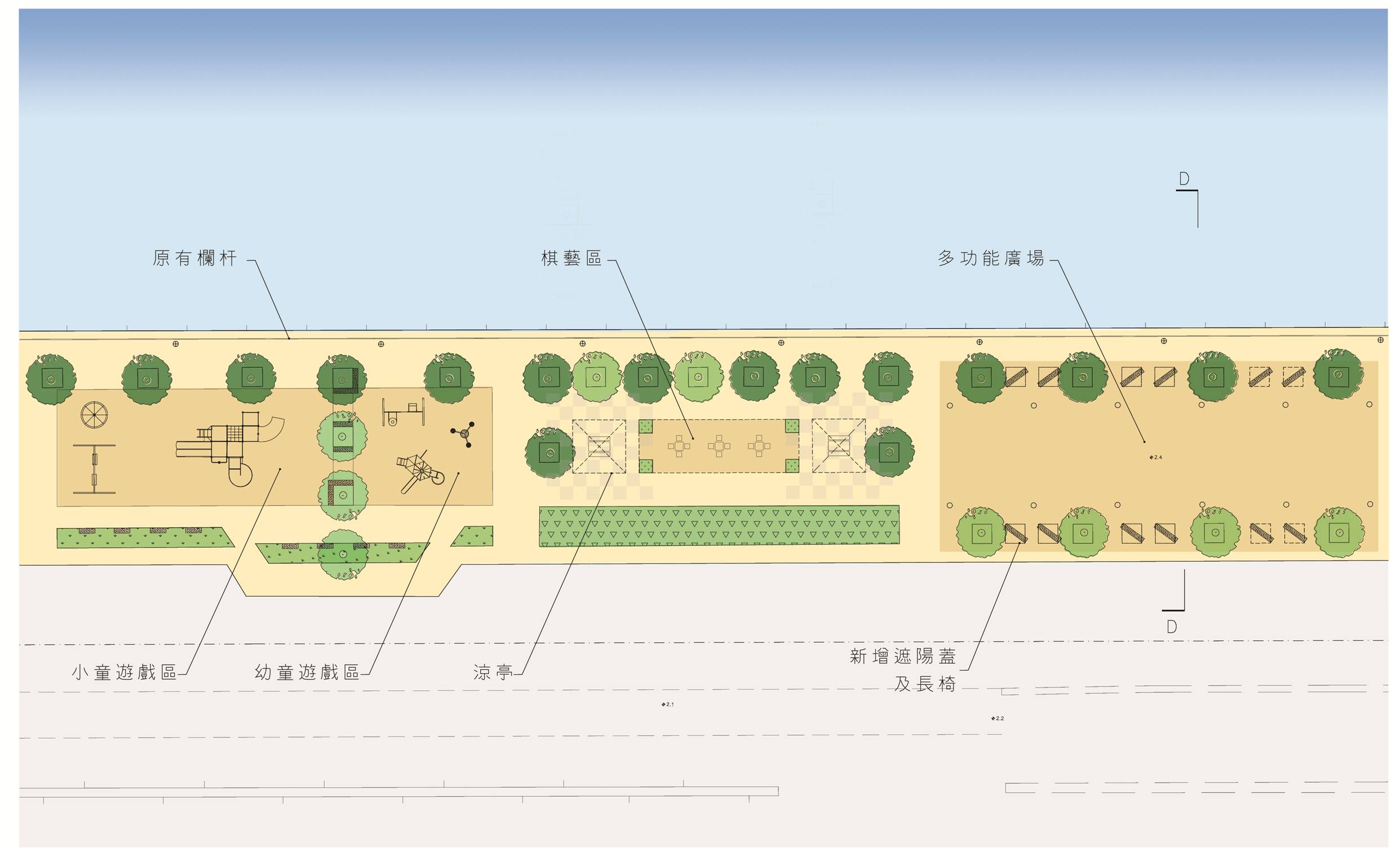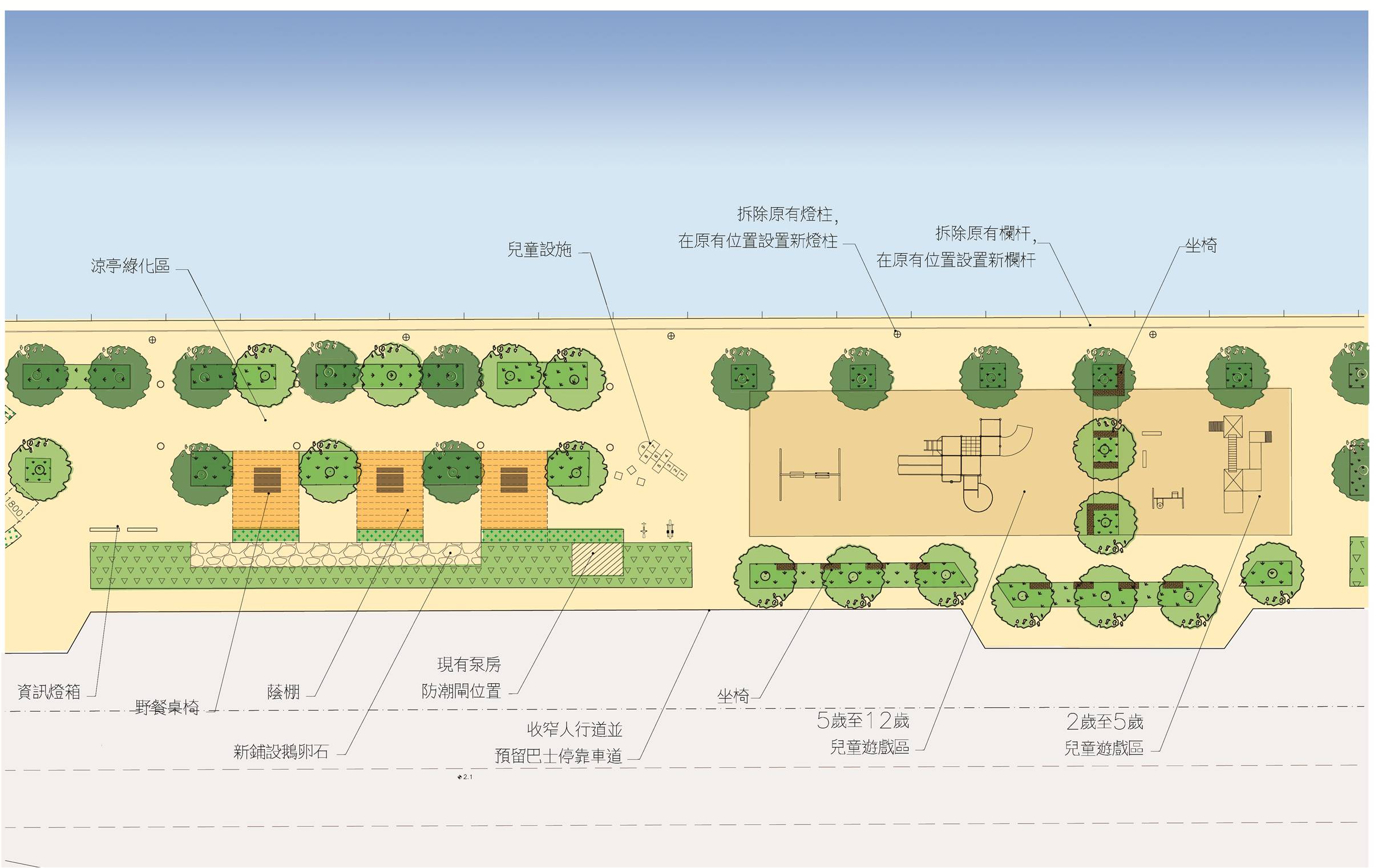 工程將分兩階段進行,除了加設蔭棚、坐椅、健身器材、兒童遊戲架等公共設施外,將重舖地磚,調整行人道邊界,更換休憩區內橙柱及沿岸欄杆等。另外,亦保留現有五十九株樹木及新種樹木二十七株,增加約四百平方米綠化面積。