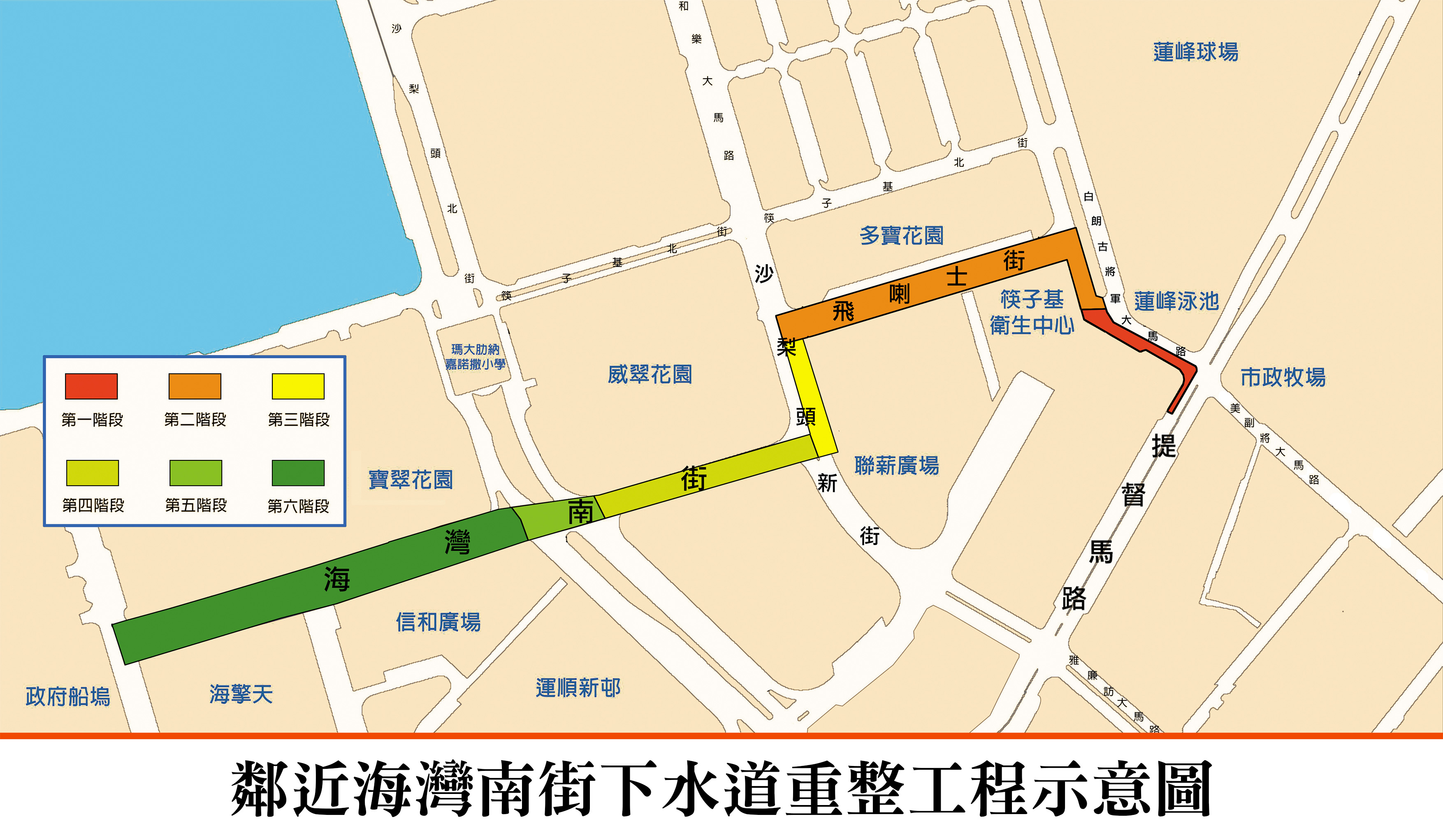 配合筷子基區的迅速發展,為增加區內污水下水道的排水能力,土地工務運輸局將於短期內開展“鄰近海灣南街下水道重整工程",更換包括海灣南街、沙梨頭新街、飛喇士街及白朗古將軍大馬路的污水下水道管網。考慮到工程範圍涉及多個路段,為減低對交通的影響,工程計劃分六個階段進行,工期約270日。期間,土地工務運輸局與交通事務局將緊密溝通聯繫,因應實際施工情況對相關臨時交通安排作出調節。