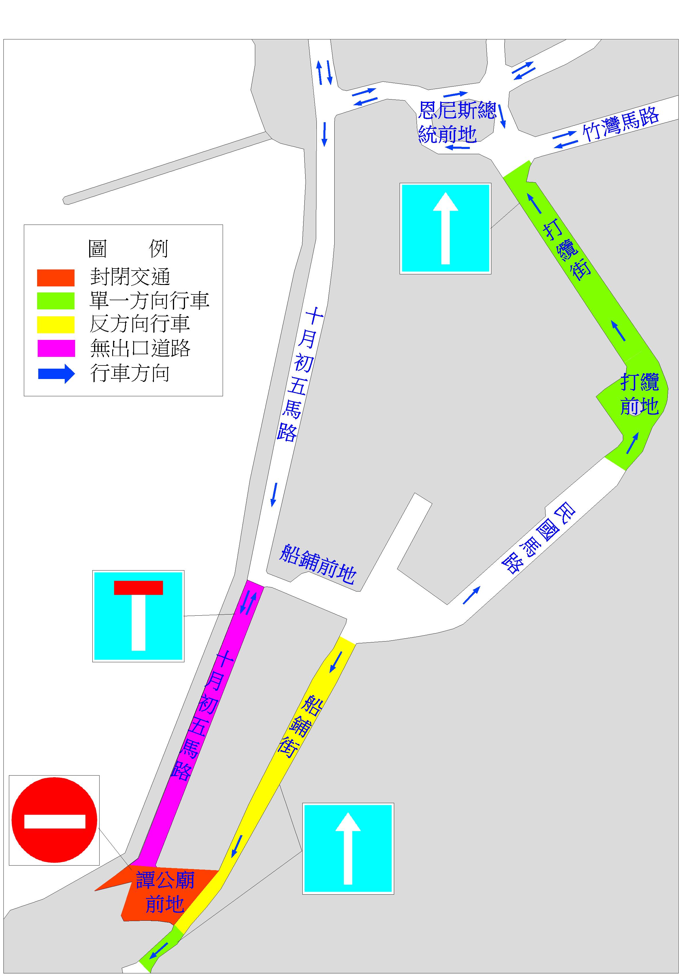 此外,介乎高勵雅馬路與偉龍馬路之間的一段氹仔雞頸馬路(由高勵雅馬路駛往孝思墳場再駛往偉龍馬路的方向)、路環打纜街及打纜前地(由打纜前地往恩尼斯總統前地方向)、介乎船鋪前地與譚公廟前地之間的一段路環十月初五馬路(由船鋪前地往譚公廟前地方向),以及介乎譚公廟前地與鄉村馬路886號之間的一段鄉村馬路(由譚公廟前地往鄉村馬路886號方向)亦於周六、日上午8時至晚上7時,臨時改作單向行車。