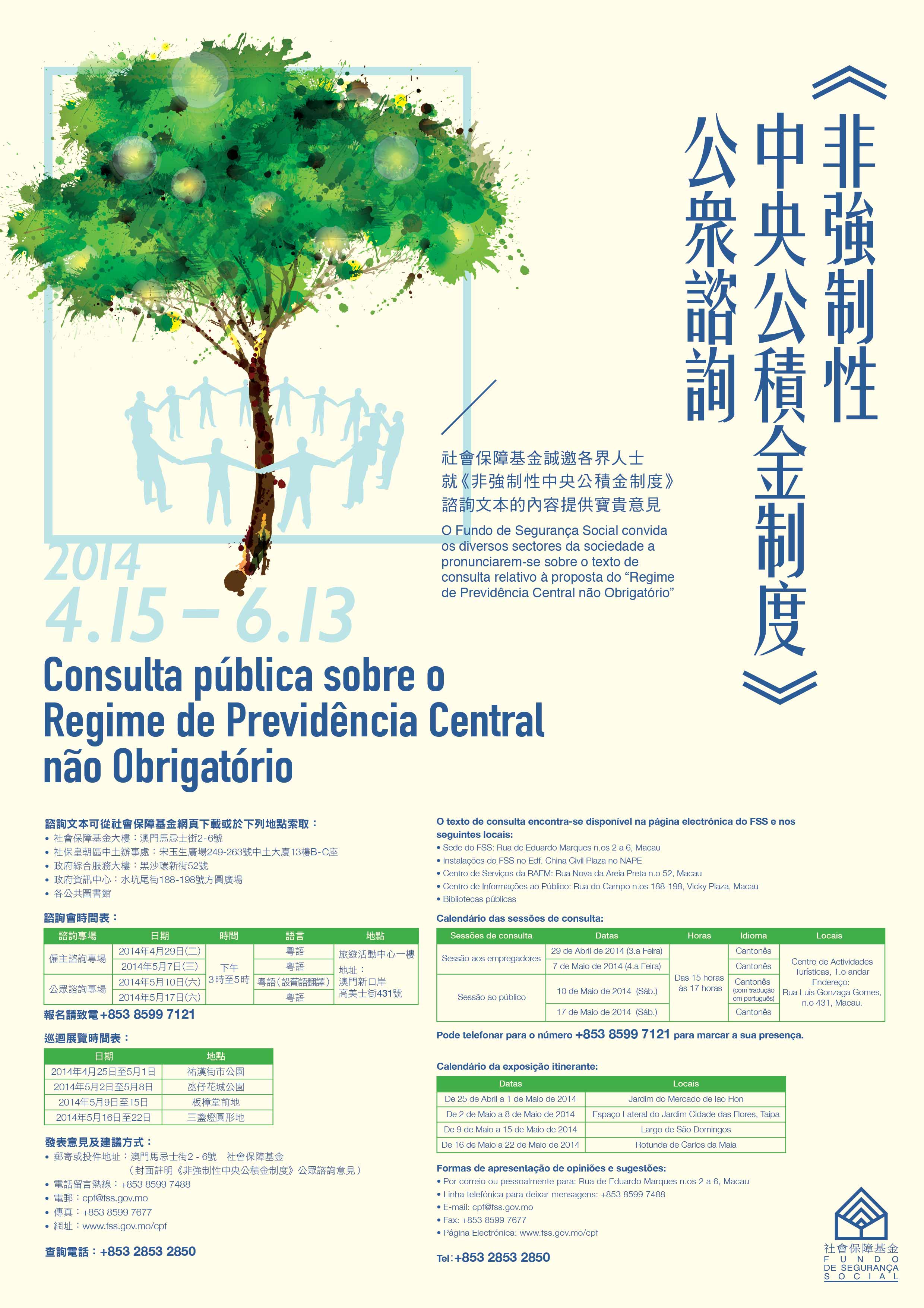 《非強制性中央公積金制度》與全澳市民息息相關,社保基金十分重視社會各界的意見和建議,將透過舉辦諮詢會及巡迴展覽等多種形式,讓公眾瞭解建議方案的內容,市民可瀏覽專題網頁www.fss.gov.mo/cpf了解諮詢活動的安排。