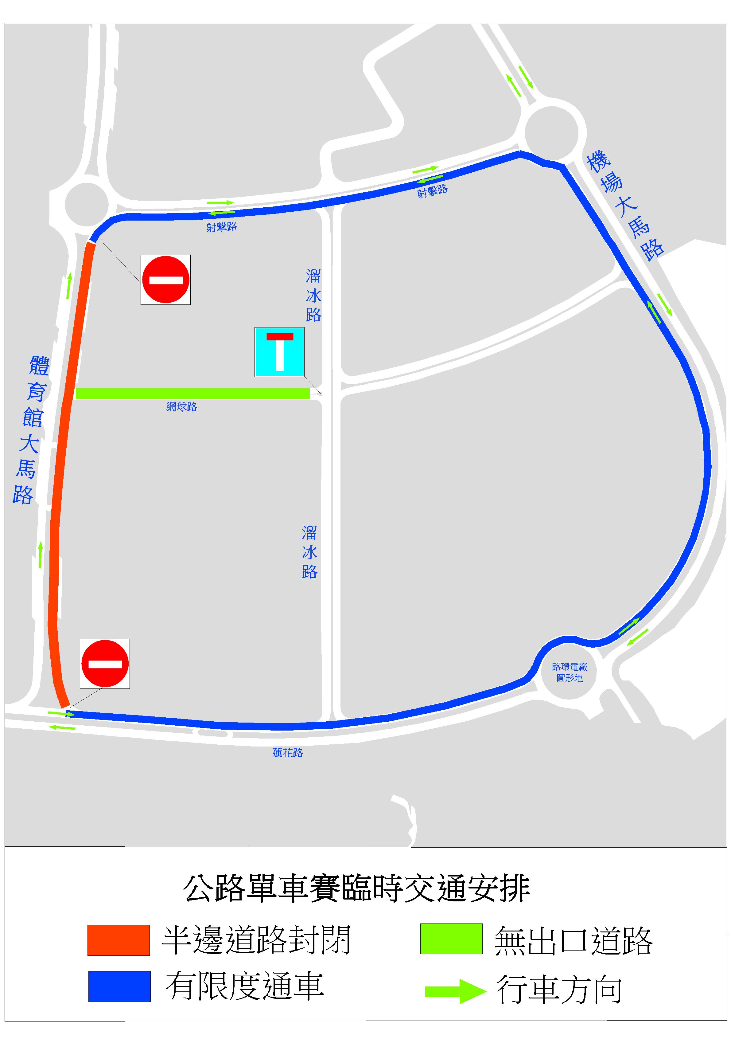 因應舉行單車賽事,本月29日(周日)清晨4時30分至早上11時,介乎射擊路與蓮花路之間一段體育館大馬路(靠向澳門東亞運動會體育館的一側車行道),即由射擊路往蓮花路方向會臨時封閉交通並禁止泊車;介乎體育館大馬路與溜冰路之間一段網球路會改為無出口道路;蓮花路、路環電廠圓形地、機場大馬路、航空圓形地及射擊路則實施有限度通車。